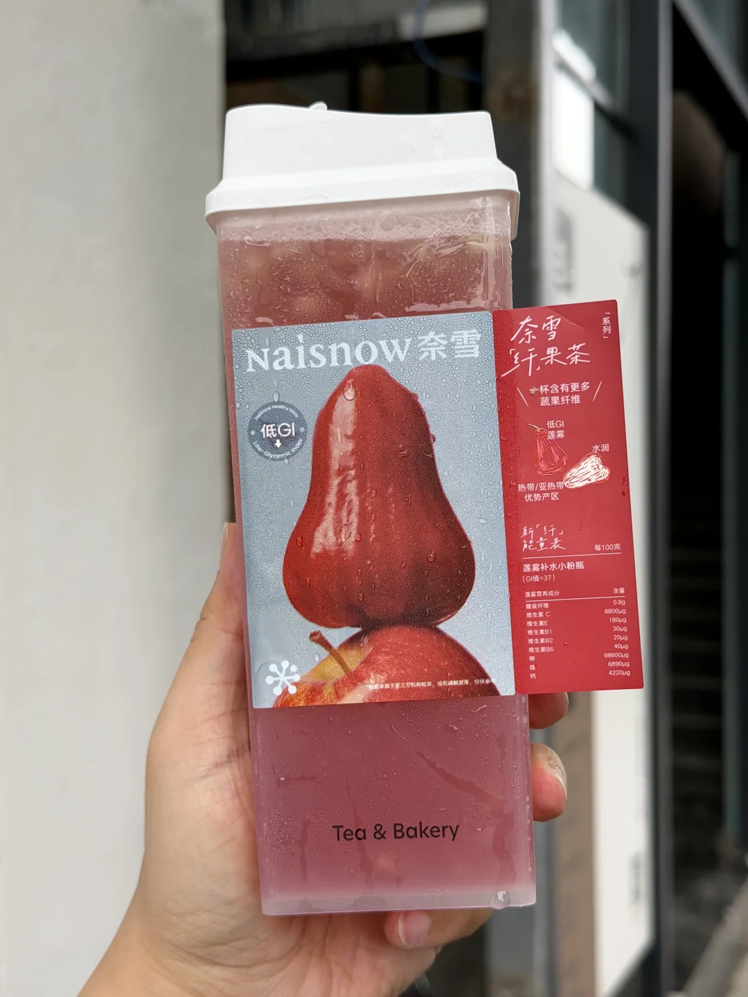 还有莲雾这种冷门水果也出现在了奈雪!莲雾补水小粉瓶🍎粉粉的很美丽的一杯!里面喝的到鲜切的莲雾和红苹果果肉,鲜脆酸甜,低GI又补水,很适合想要皮肤亮亮的宝子!