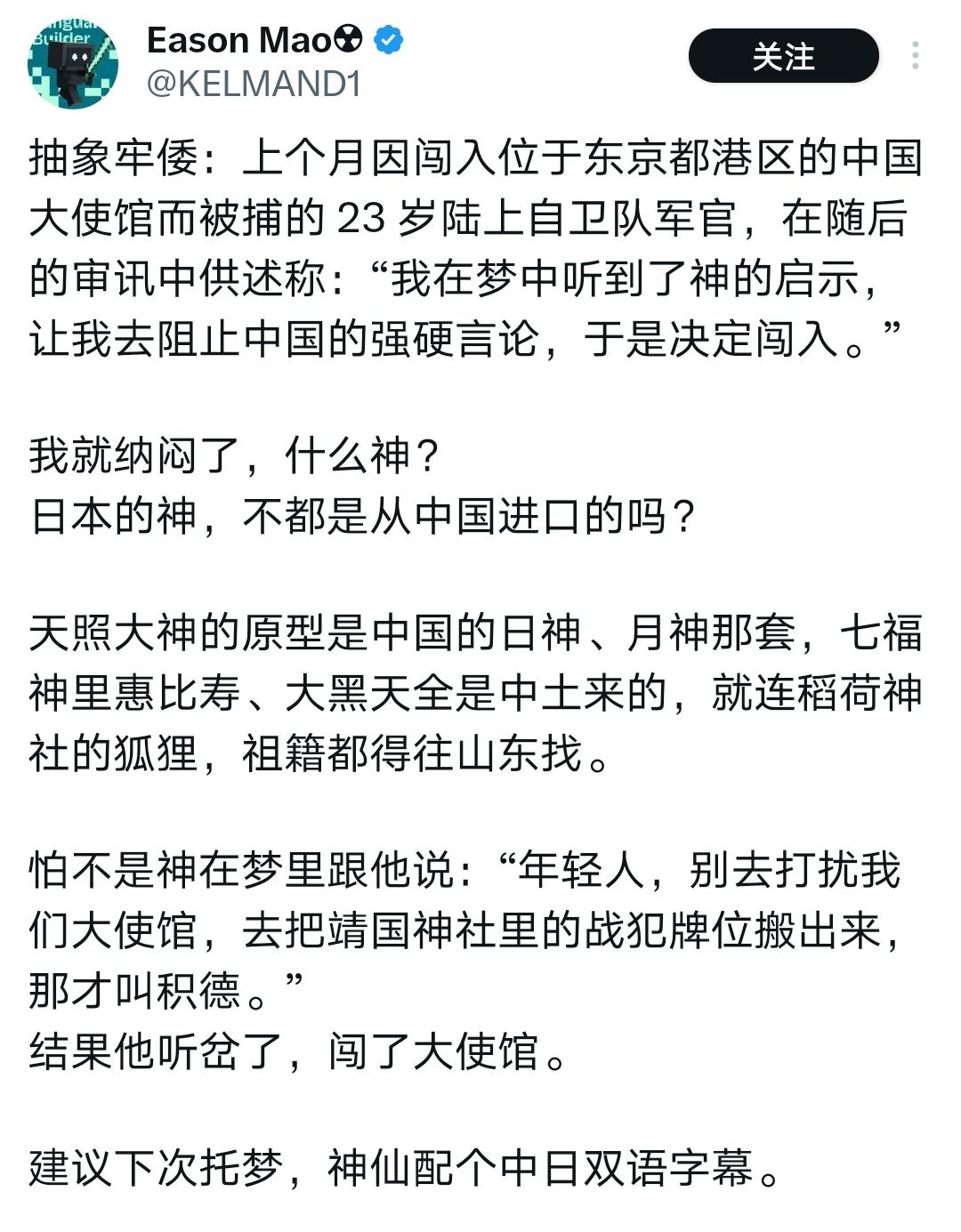 眼下,自民党正在加紧推动修宪,在国会已实现一党过半,修宪几乎没有任何实质阻力,甚至有人主张全面废止和平宪法。那么问题来了:晃大真的是在梦中听到神谕,还是极右翼势力正在刻意营造一种“神谕降临”的舆论氛围,为下一步更危险的行动做铺垫?