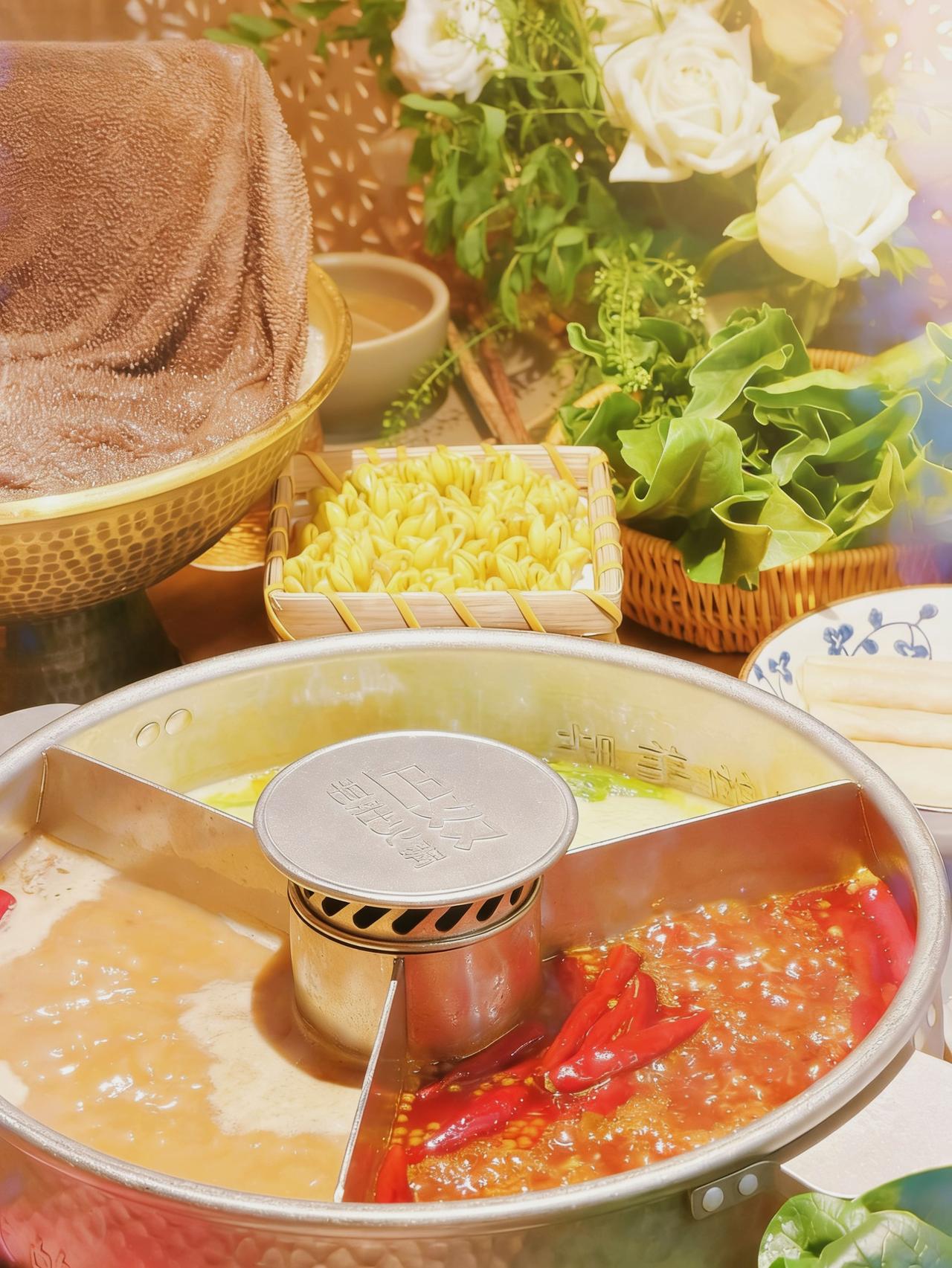 原切安格斯雪花牛肉和内蒙草原羔羊,不拼接、不调理,纹理清晰,涮完汤都不浑,肉香纯粹。还有井水黄豆芽清甜脆嫩,笨菠菜鲜嫩无渣,绣球菌吸满汤汁超入味。手打虾滑、鲜鸭血、贡菜也都品质超高。