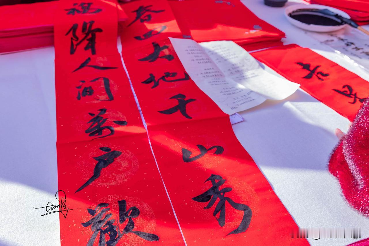 重头戏来啦!“义写送福”活动中,十余位书法名家齐聚一堂。他们展纸、蘸墨、挥洒自如,那专注的神情和娴熟的笔法,简直太有大师风范了!随着红纸翻飞,吉祥的联句和饱满的“福”字渐渐铺满长案。每一幅作品都是独一无二的手写祝愿,饱含着满满的祝福。游客们有序排队,领取这份带着手写温度的新春礼物,拿到春联和福字的那一刻,脸上都洋溢着幸福的笑容。