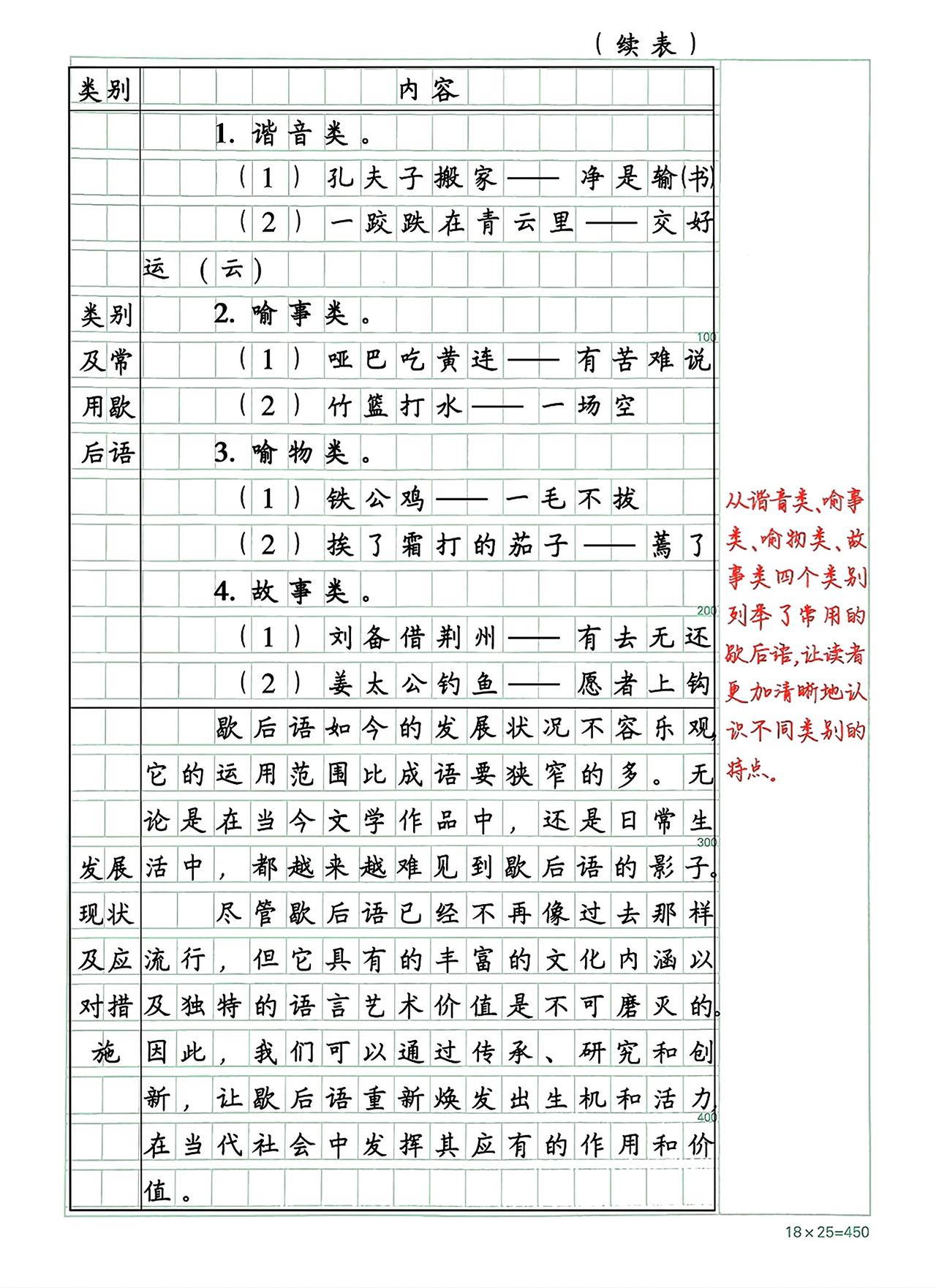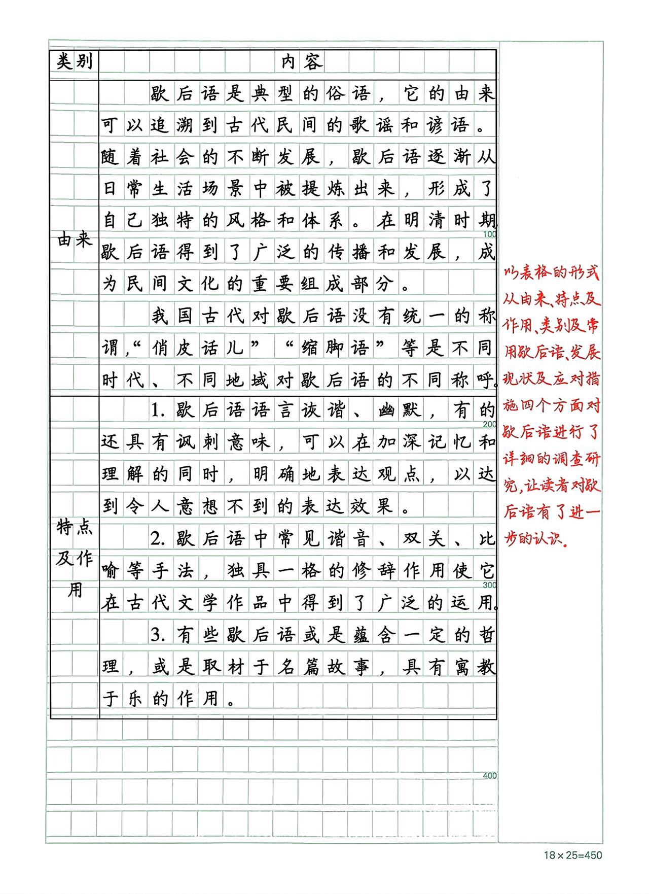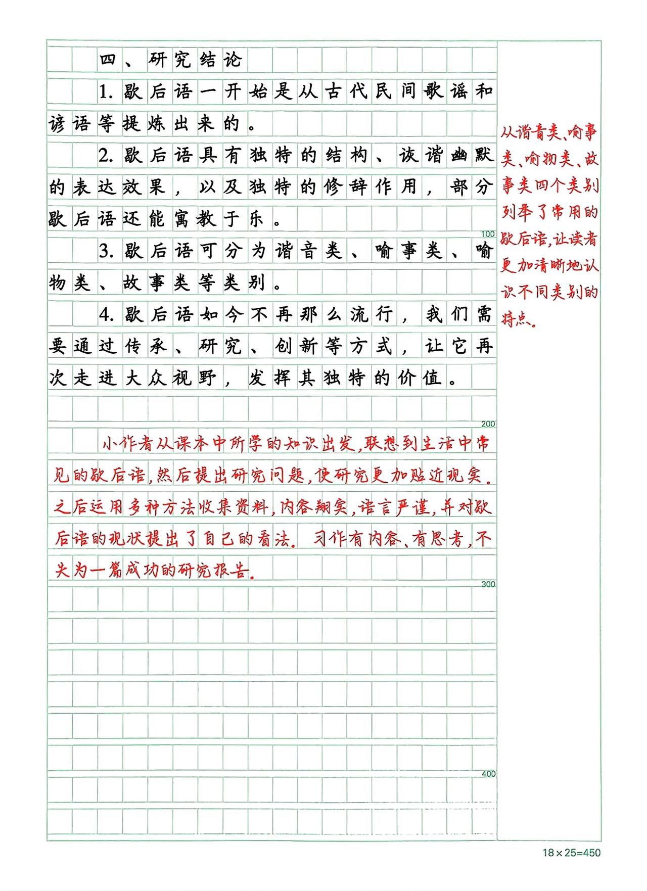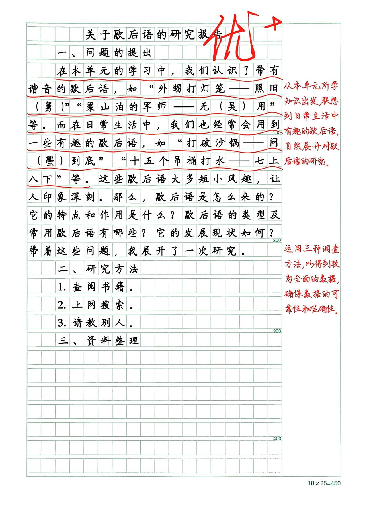 《关于歇后语的研究报告》点评:小作者从谋本中所学的知识出发,联想到生活中常见的歌后语,然后提出研究问题,使研究更加贴近现实。之后运用多种方法收集资料,内容翔实,语言严谨,并对歇后语的现状提出了自己的看法。习作有内容、有思考,不失为一篇成功的研究报告。
