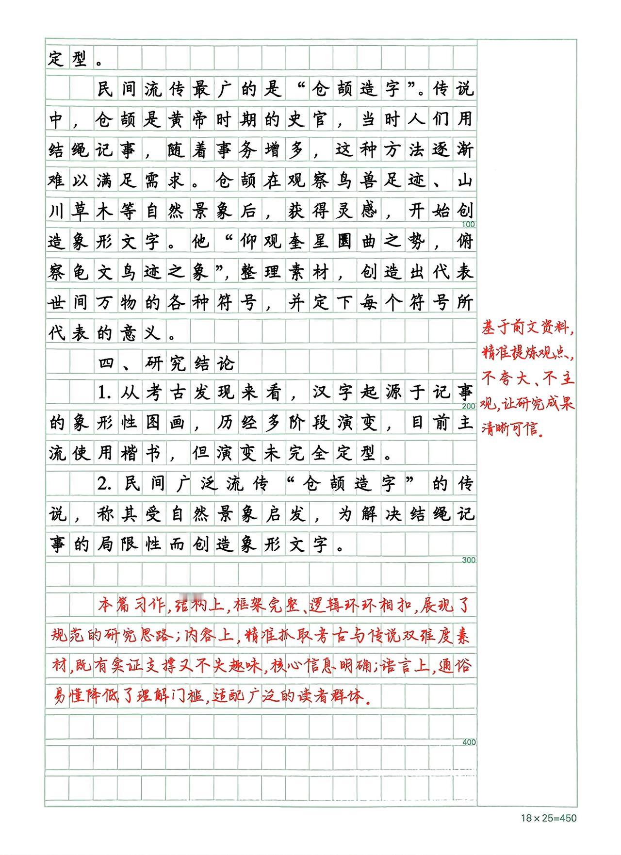 《关于汉字起源的研究报告》点评:本篇习作,结构上,框架完整、逻辑环环相扣,展现了规范的研究思路;内容上,精准抓取考古与传说双维度素材,既有实证支撑又不失趣味,核心信息明确;语言上,通俗易懂降低了理解门楂,适配广泛的读者群体。