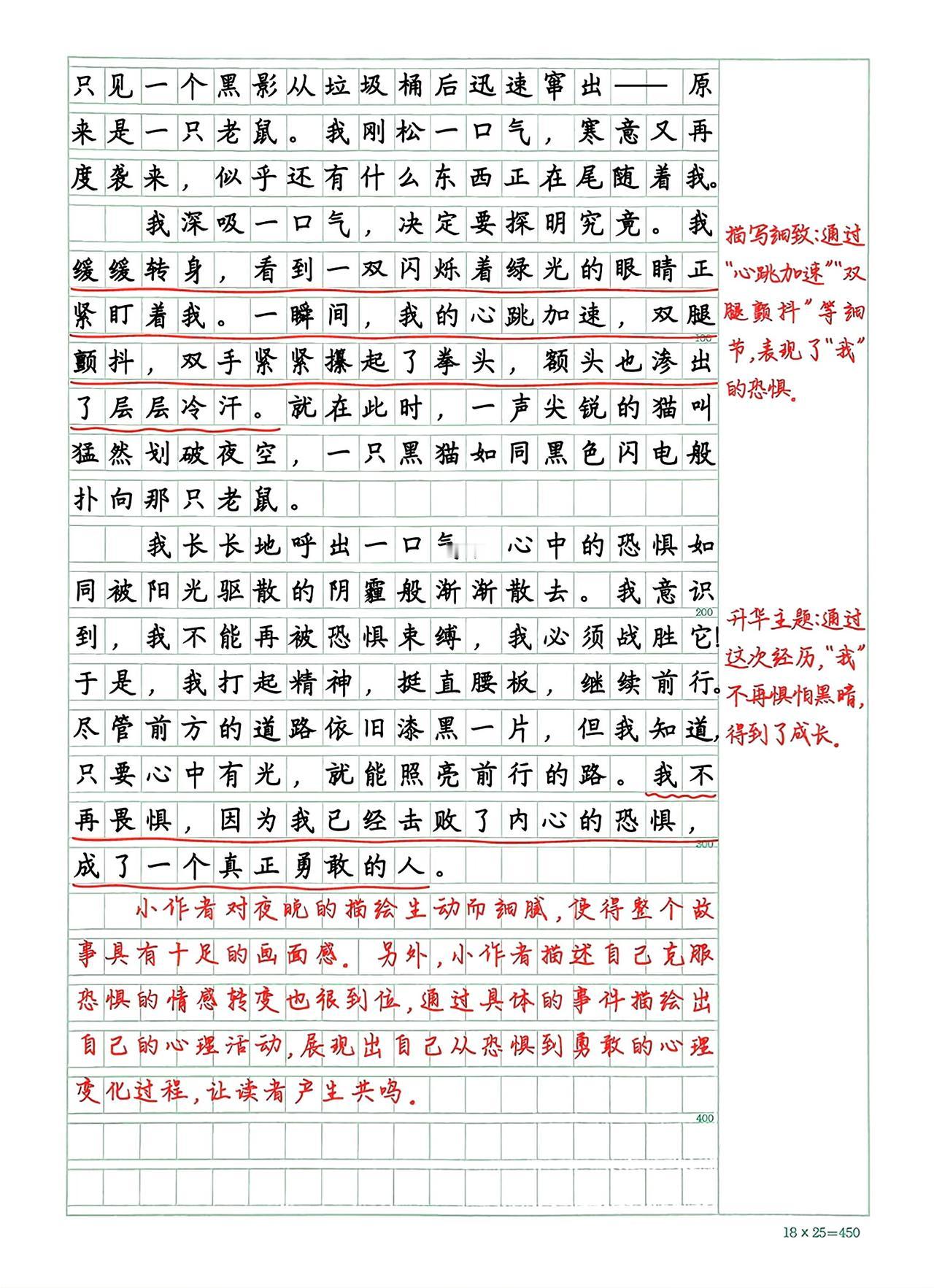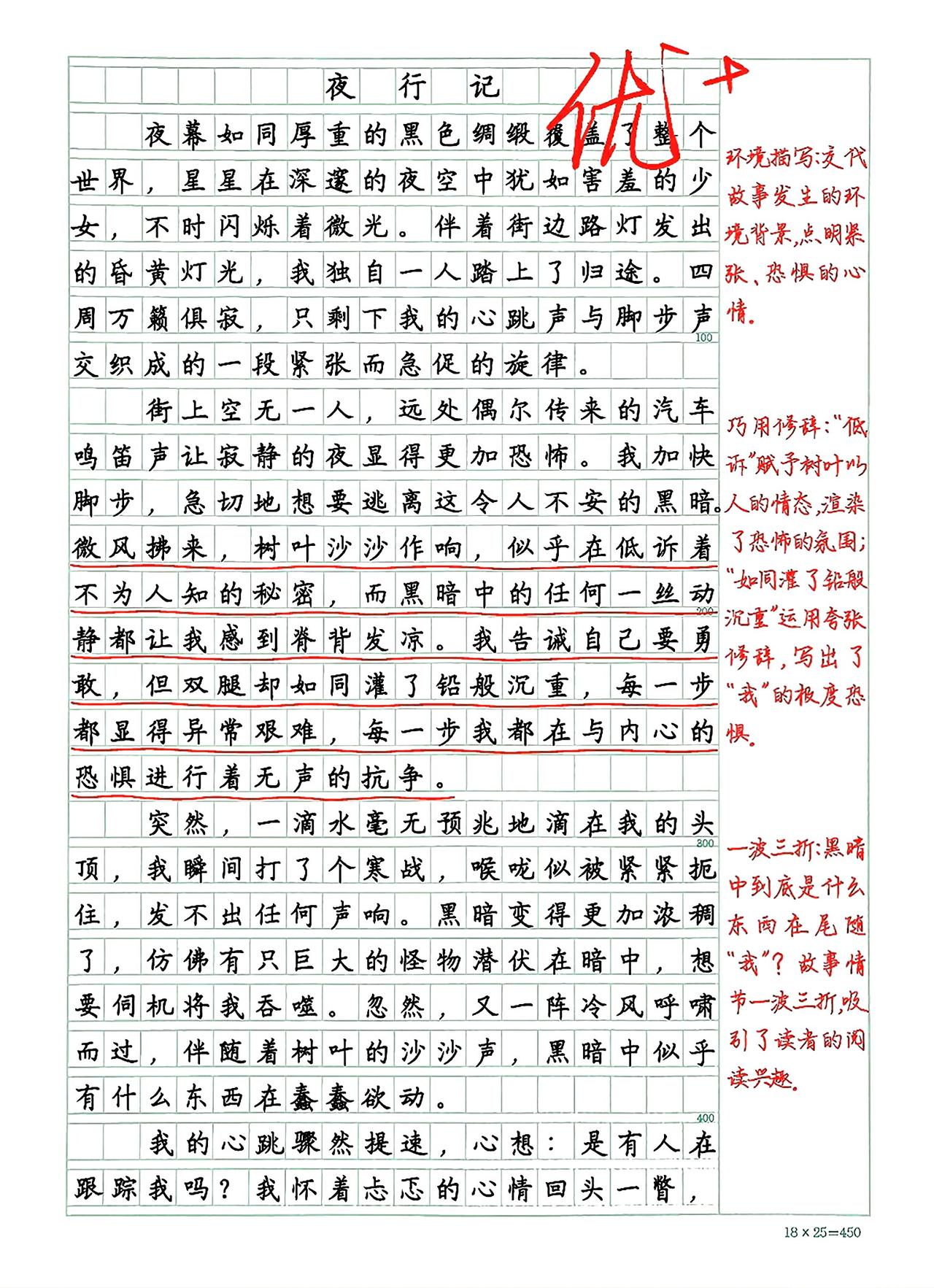 《夜行记》点评:小作者对夜晚的描绘生动而细腻,使得整个故事具有十足的画面感。另外,小作者描述自己克服恐惧的情感转变也很到位,通过具体的事件描绘出自己的心理活动,展现出自己从恐惧到勇敢的心理变化过程,让读者产生共鸣。