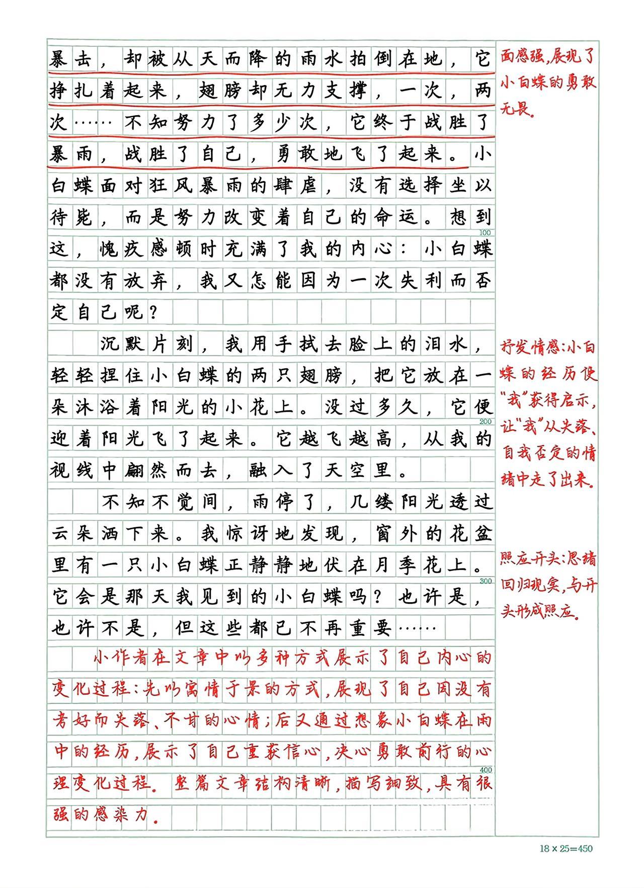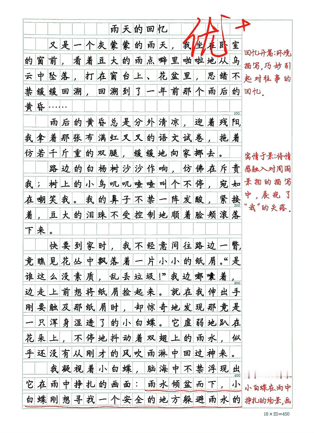 《雨天的回忆》点评:小作者在文章中以多种方式展示了自己内心的变化过程:先以寓情于景的方式,展现了自己因没有考好而失落、不甘的心情;后又通过想象小白蝶在雨中的经历,展示了自己重获信心,决心勇敢前行的心理变化过程。整篇文章结构清晰,描写细致,具有很强的感染力。