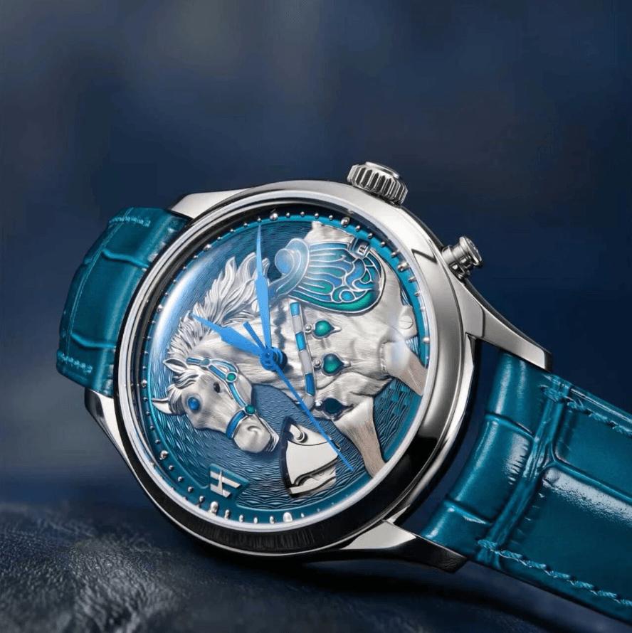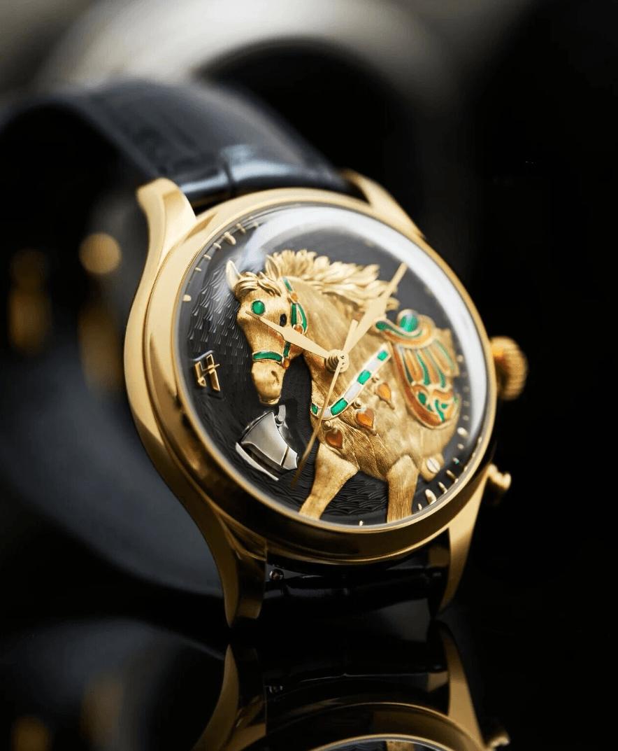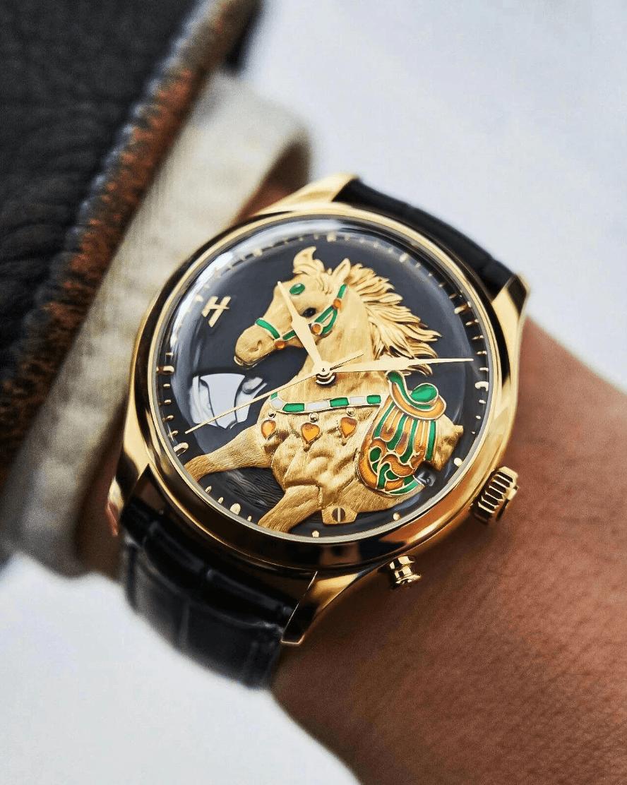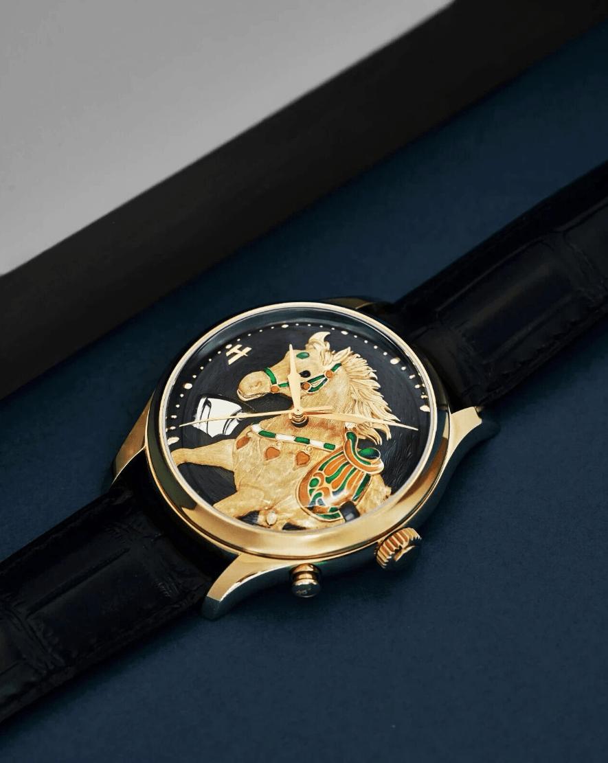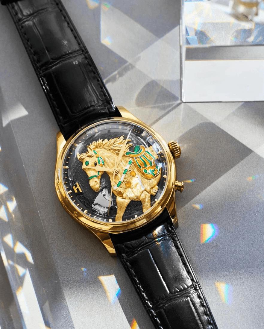 【这才是马年腕表的顶流 国表】当我第一眼看见这只腕表的时候,万万没想到,这竟然是一只国产腕表,真乐时确实惊讶到我,具备顶奢级自鸣钟功能,万元级有自鸣钟功能的腕表,仅此一家,要知道百达翡丽自鸣钟起步在80万多,腕表还融合了动偶,采用玑镂、金雕、珐琅,骏马跃然表盘,惟妙惟肖,每到整点,马嘴会张开,伴随着清脆的叮声,背透机芯也有新意,有一枚马年金币,外圈是奔腾的红色马雕,每一只马都不一样,是奔腾时候的一个动作,抛开机芯不谈,国产腕表的设计真正站起来了,您如何评价这只国产腕表?留言和表友探讨。二手腕表