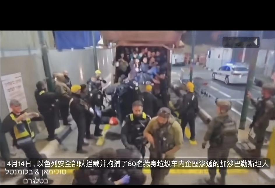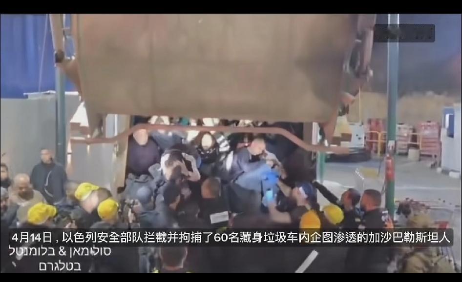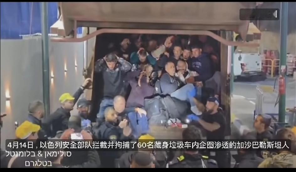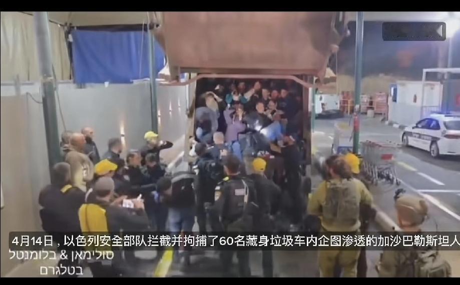 4月14号,以色列安全部拦截并拘捕了60名藏身在垃圾车内,企图渗透到加沙的巴勒斯