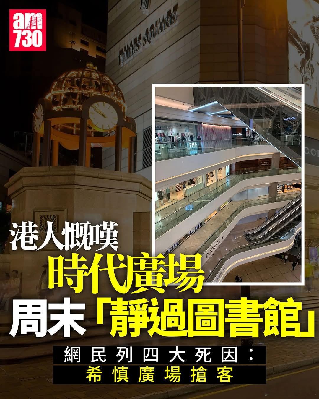 港媒:铜锣湾时代广场周末「静过图书馆」网民讨论死因AM730报道,有网民发文,称周末下班后途经铜锣湾,当时距离晚饭尚有一段时间,顺道到时代广场闲逛。然而,他发现场内情况颇为冷清,据其拍摄照片及影片可见,商场中庭及部分楼层人流稀少,形容「整个商场竟然静过图书馆,人影都没有,真系有点心酸。」帖文引起网民热议,不少人有同感及感叹:「现在去那都系借厕所」、「千禧年那阵时好旺,现在世事只能回味了!」、「静了好几年了」、「其实实体店怎么样都斗不过网店,越来越少人行街系正常」。粤港澳大湾区有香港人去深圳买一周的菜