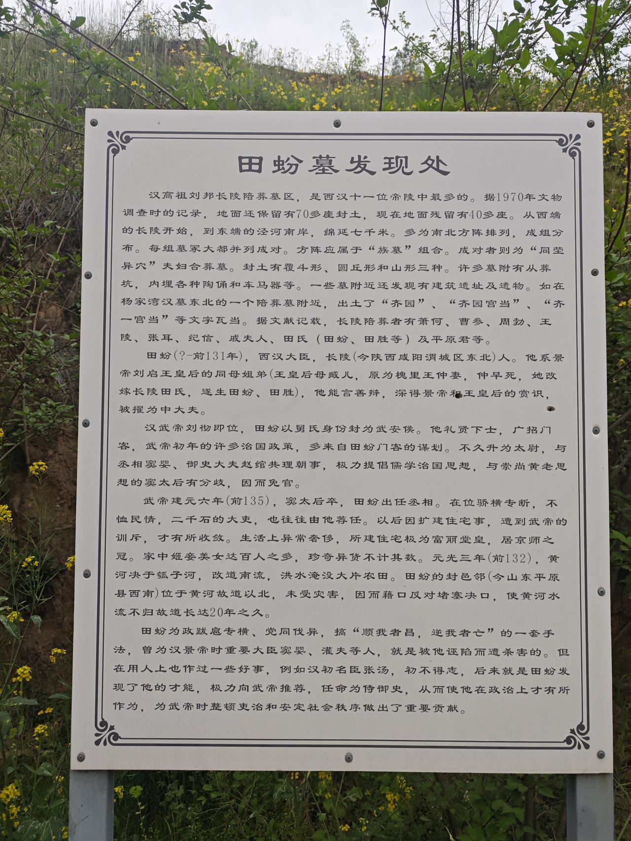 田蚡墓出现在这里也不难理解,这里距离汉长陵与汉阳陵都不太远。只是看见“田蚡墓发现处”几个字时,就让人自然而然地想起了“汉家天下”的那些宫廷内斗的场面来……