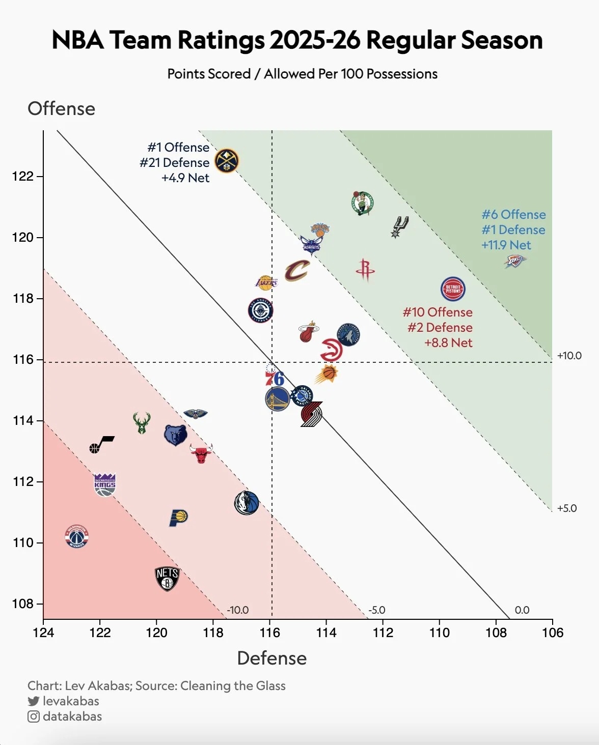 本赛季球队效率榜,雷霆综合高居联盟第一!