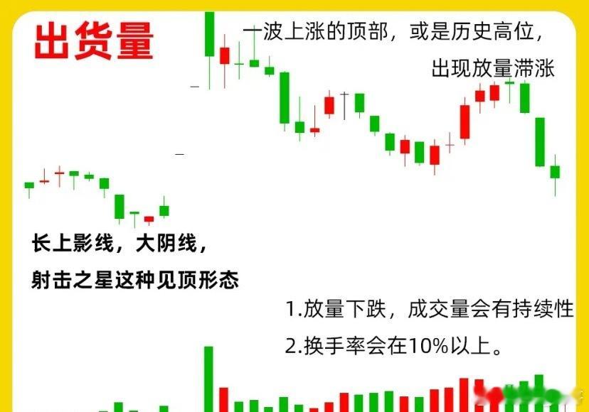 股价经过长时间的上涨以后,股价在高位,出来巨量或是天量,成交量异常放量,而K线可以是阳线或是阴线,说明此时的市场有很大分歧。像我们常说的放量滞涨,指的就是出货量,买盘的承接力量小于卖盘的抛压。