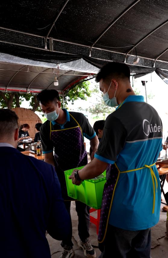 正纠结呢,刷到后续:美的连夜去装了空调。就餐区、后厨都安排上了,还配了油烟机、热水器、洗衣机,甚至派美的工程师去帮工。