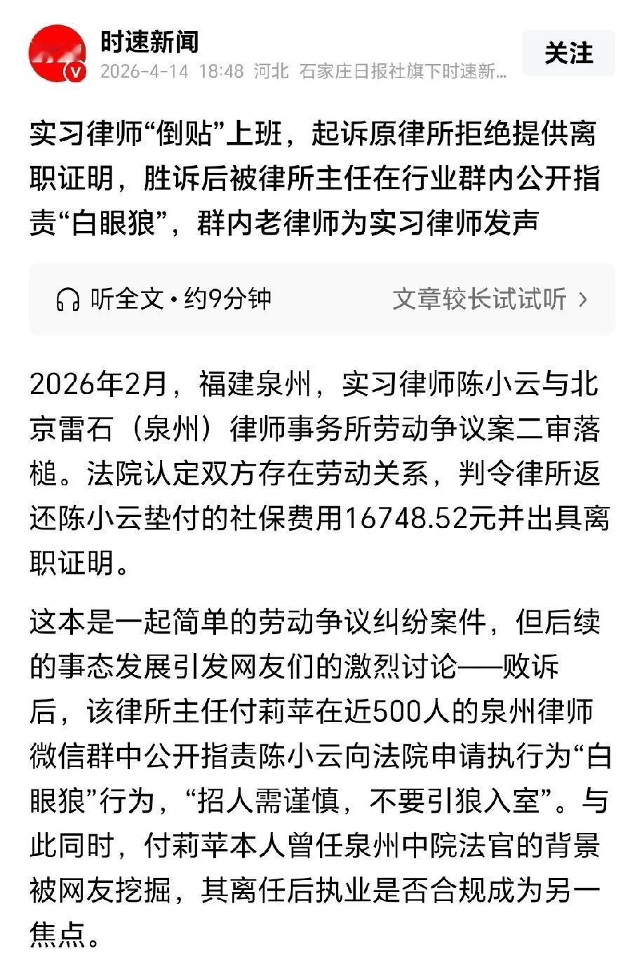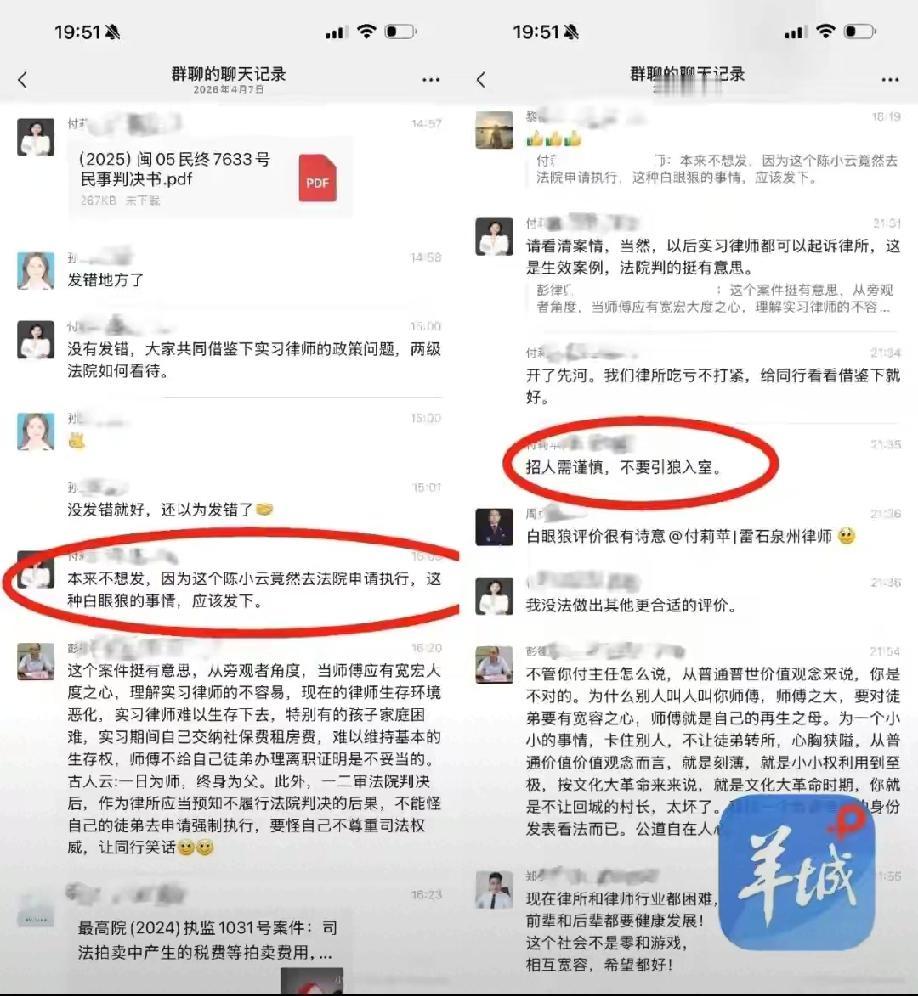2026年4月,律所主任付某在一个近500人的泉州律师微信群里,发出了法院的判决书,还配文指责陈女士是个白眼狼,不让其他律所“引狼入室”。