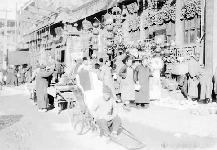 清朝,北京街头,一位外国水兵端坐车上,一位清朝男子在一侧坐着协助维持平衡,照片中