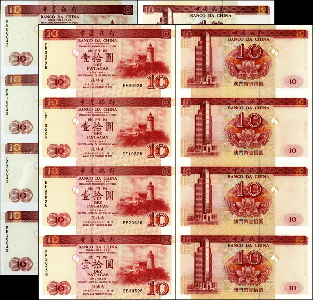 本文介绍的连体钞属于未公开发行系列之一,他就是澳门中国银行2002年版10元四连体。
