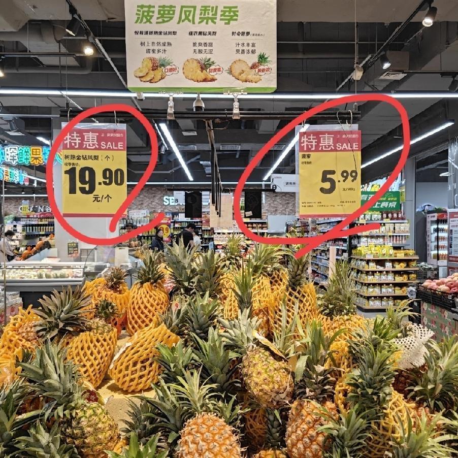 昨天在未来城万科广场里边的<家家悦超市>,看到这里卖的凤梨竟然是19.90元一个