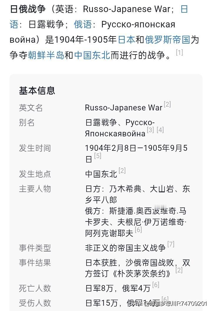 1904年2月8日—1905年9月5日,日本帝国和沙俄帝国为争夺朝鲜和我国东北地盘进行的战争。日军参战兵力大约十五万人,沙俄参战兵力大约十四万人。