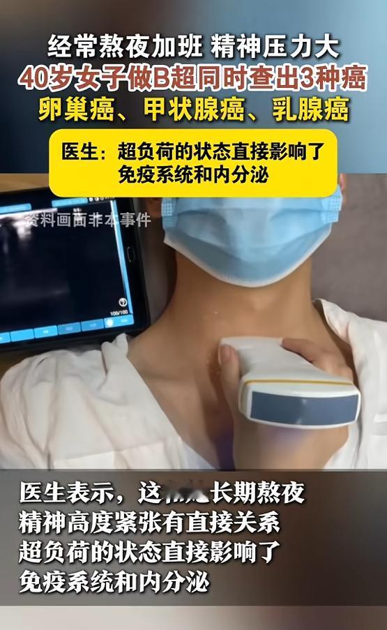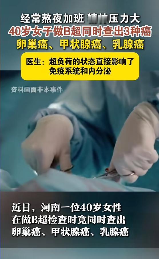 "悲剧还是发生了!河南,一女子因工作原因,经常需要值夜班,并且每隔三天就需要值一次24小时的班,长期精神紧张和严重紊乱身体让她身体不堪重负,当她听医生的建议做全面筛查时,经发现自己卵巢、乳腺和甲状腺同时发现癌变!网友:太吓人了!