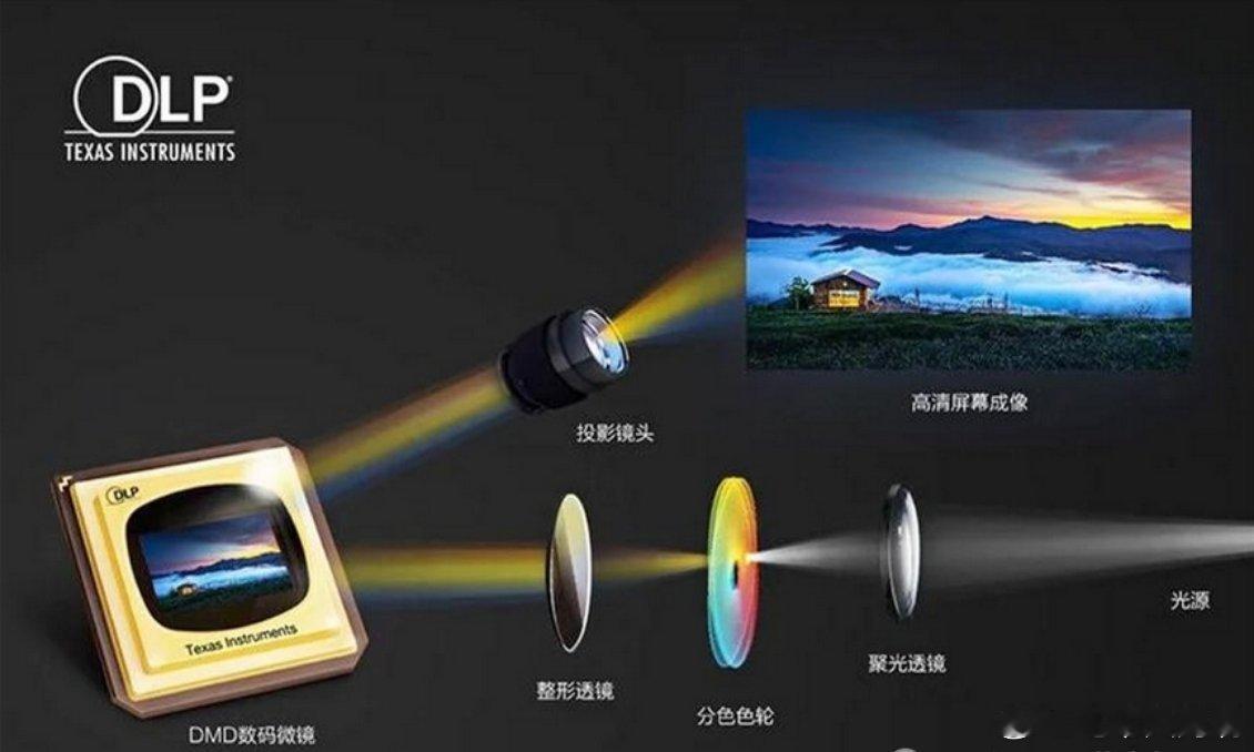 以华为为代表的DLP则是“光源反射成像”(LED光源通过DMD芯片上百万个微米级镜片反射成像)。这项技术由德州仪器(TI) 在1987年发明。它的核心是一块名为 DMD(数字微镜器件) 的芯片,这块芯片上集成了数百万个可以独立翻转的微型镜片,通过控制这些镜片来反射光线,从而形成图像。简单来说,DLP大灯的工作原理跟我们家里用的投影仪如出一辙,就是:光源发光 → DMD芯片上的微镜反射光线 → 通过镜头投影到路面。与真正投影仪的区别是,目前汽车的DLP投影大灯只能投黑白画面,主要原因是彩色画面亮度太低,所以即使DLP大灯像素再高,你也只能看黑白电影。还有一点要说的是,DLP的核心DMD芯片全球有且只有TI一家可以做,属于强技术垄断。