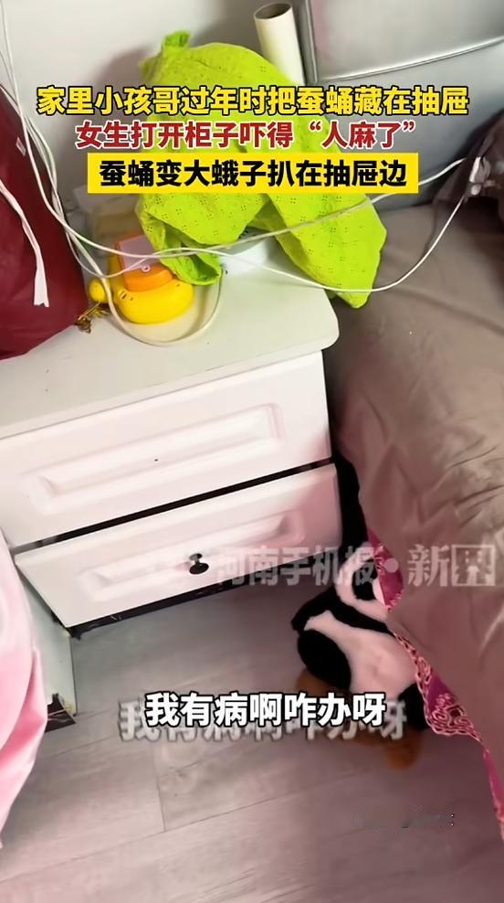 (信息来源:《家里小孩哥过年时把蚕蛹藏在抽屉,女生打开柜子吓得"人麻了,蚕蛹变大蛾子扒在抽屉边。》新界视频)