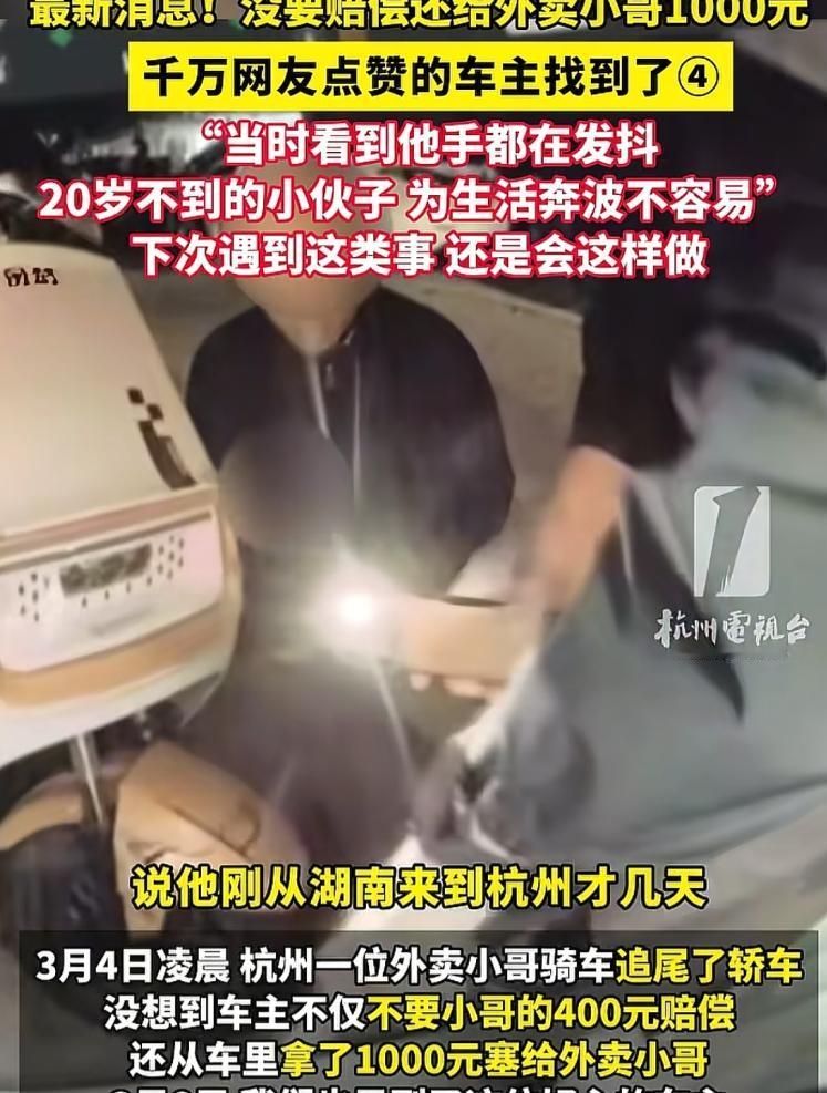 “浙江又上大分了!”杭州,男子在路边正常停车,突然听到“砰”的一声,一外卖小哥骑着电动车,撞到了男子的车尾。男子下车后问小哥有没有事,小哥说自己只是摔破了皮,无大碍。男子看到自己车位雷达被撞坏了,准备报警定损,可没想到,外卖小哥却请求他能不能不要报警,说自己才来上班没几天,没赚到钱,能不能先赔400元?男子一时心软,转身上了车,做了一个谁也没想到的举动。