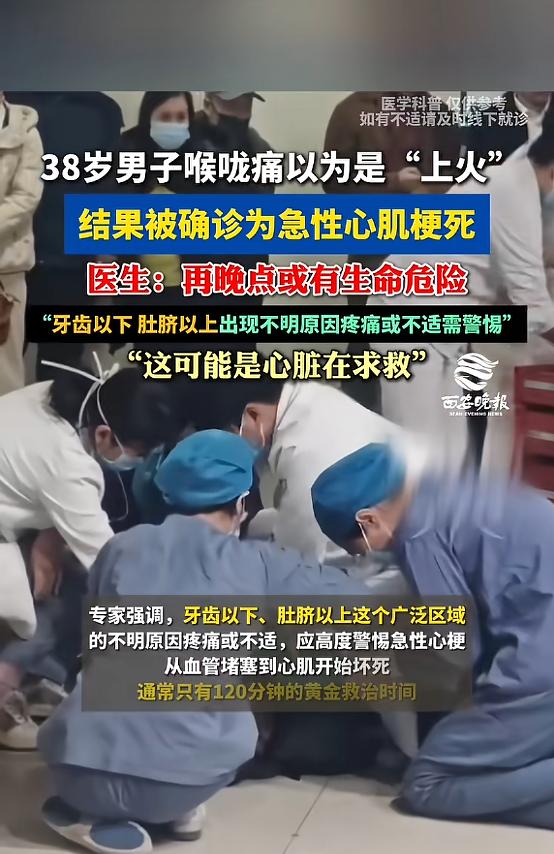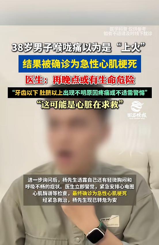 (信息来源:《38岁男子喉咙痛以为是“上火”,一查竟是心梗,医生提醒:警惕“隐藏款”心梗》西安晚报)