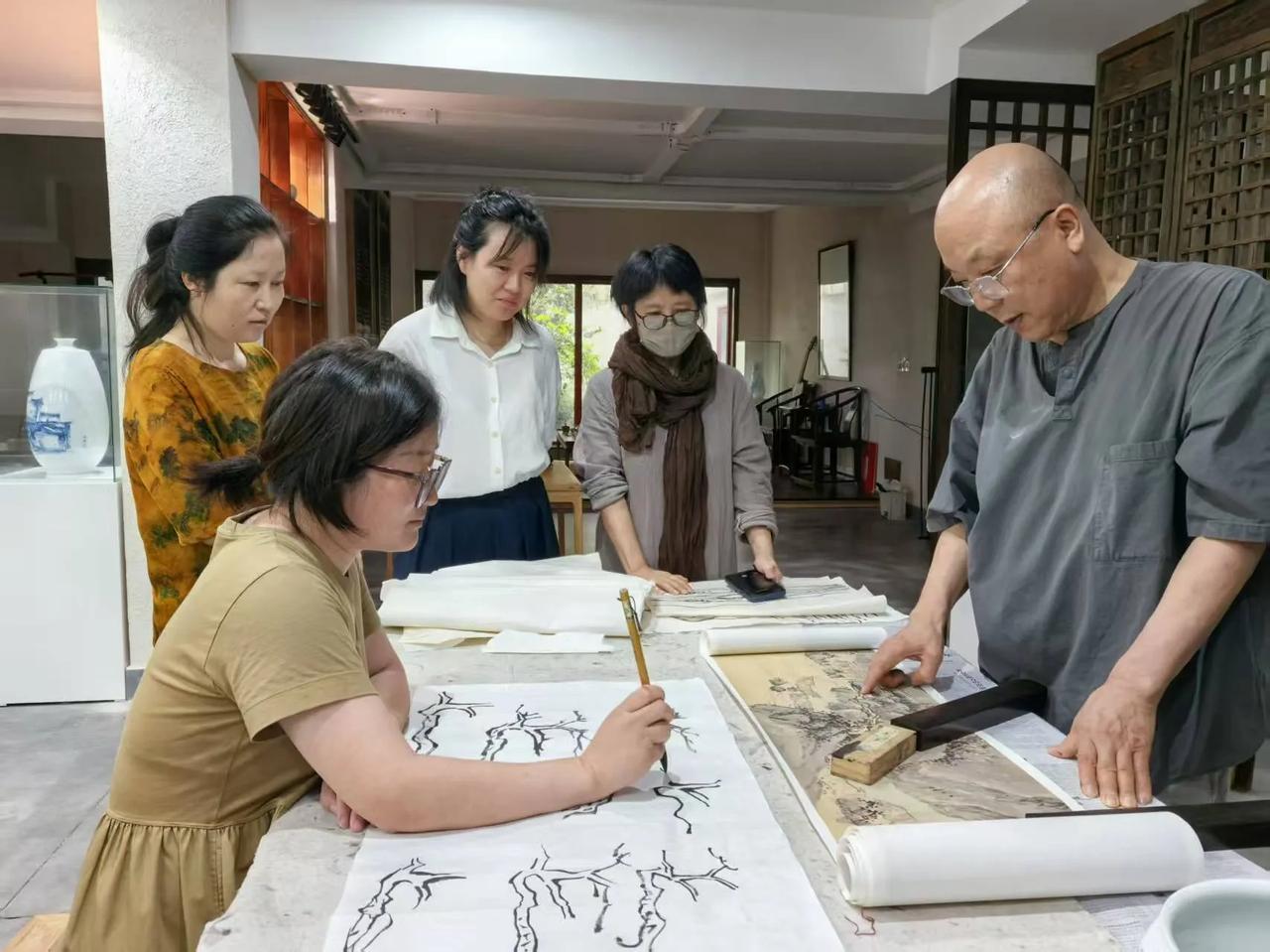 登岛四望,夕阳垂波,金辉满湖;古木疏朗,姿态天然;远山含黛,龙脉隐现。奇石罗布,皴法天成,师临石而讲,细论山水笔墨之旨,吾辈静听,如醉如痴,恍入宋元古画之中。