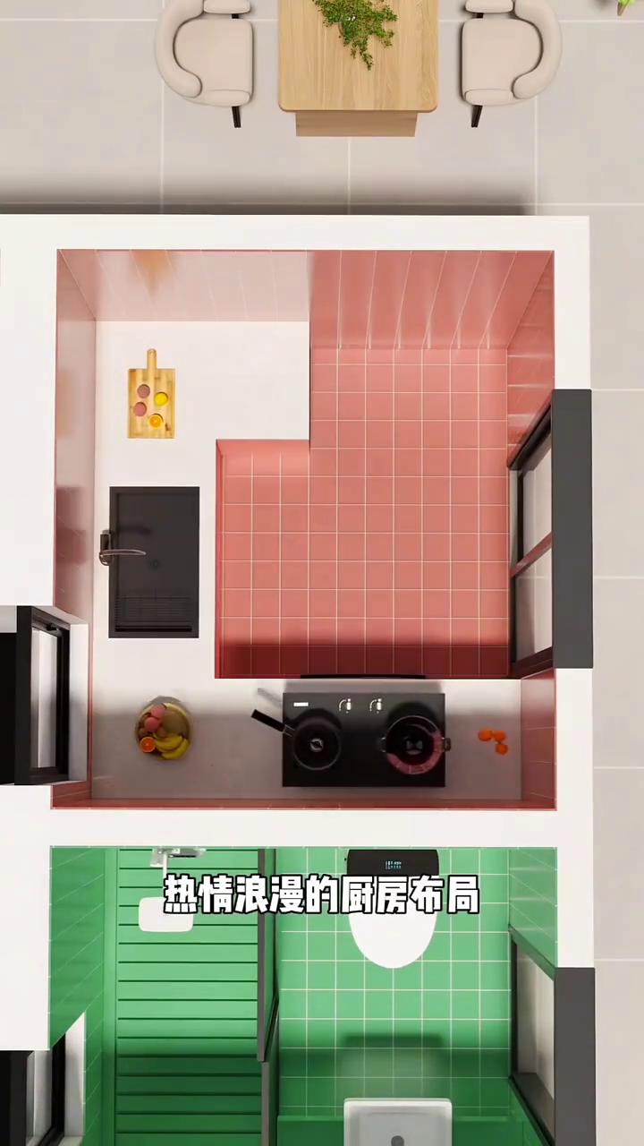 →粉色象征夏天,热情浪漫的厨房布局,再放上一组超大冰柜,放入海量雪糕,实现雪糕自由。