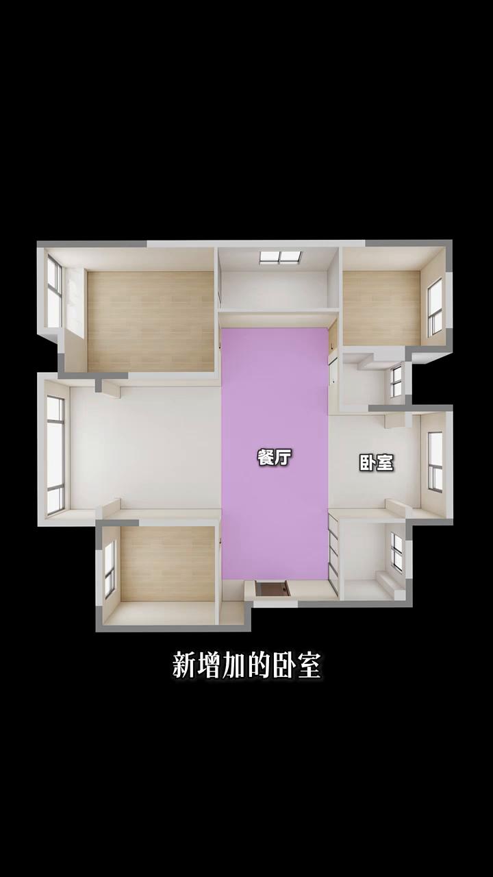原始户型刨去厨卫,有5个窗户,其中3间卧室,一个客厅一个餐厅。想增加卧室还有采光,最佳的选择就是把餐厅改成卧室,但是餐厅就没地方放了,6口人住还得要一个大餐厅。今天用一招空间三分法,解决所有的三室改四室。