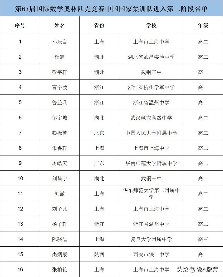 2026年第67届IMO国家集训队第二阶段名单公布,本次入围16人,邓神排在第一,这个连续2024和2025两届cmo满分金牌,标准答案制定者!还有2025已经是imo满分金牌了,这是第二次来啦!这次16人名单上海是最大赢家有6人,其次湖北4人和浙江3这样的传统强省,北京这次只有一人,广东一人和陕西一人,湖南这次没有人入围有点遗憾。厦门一中王子豪是国集60人选手之一!各位厦门牛娃家长可以来看看这些超级学霸,祝各位粉丝的孩子都变成这样的顶级学神。