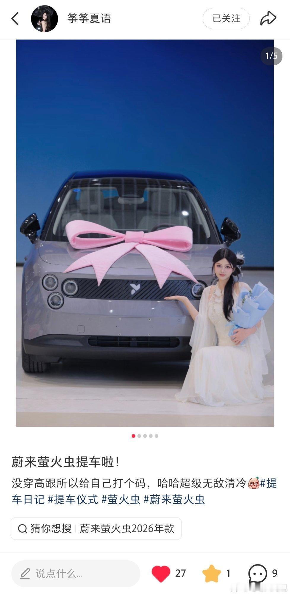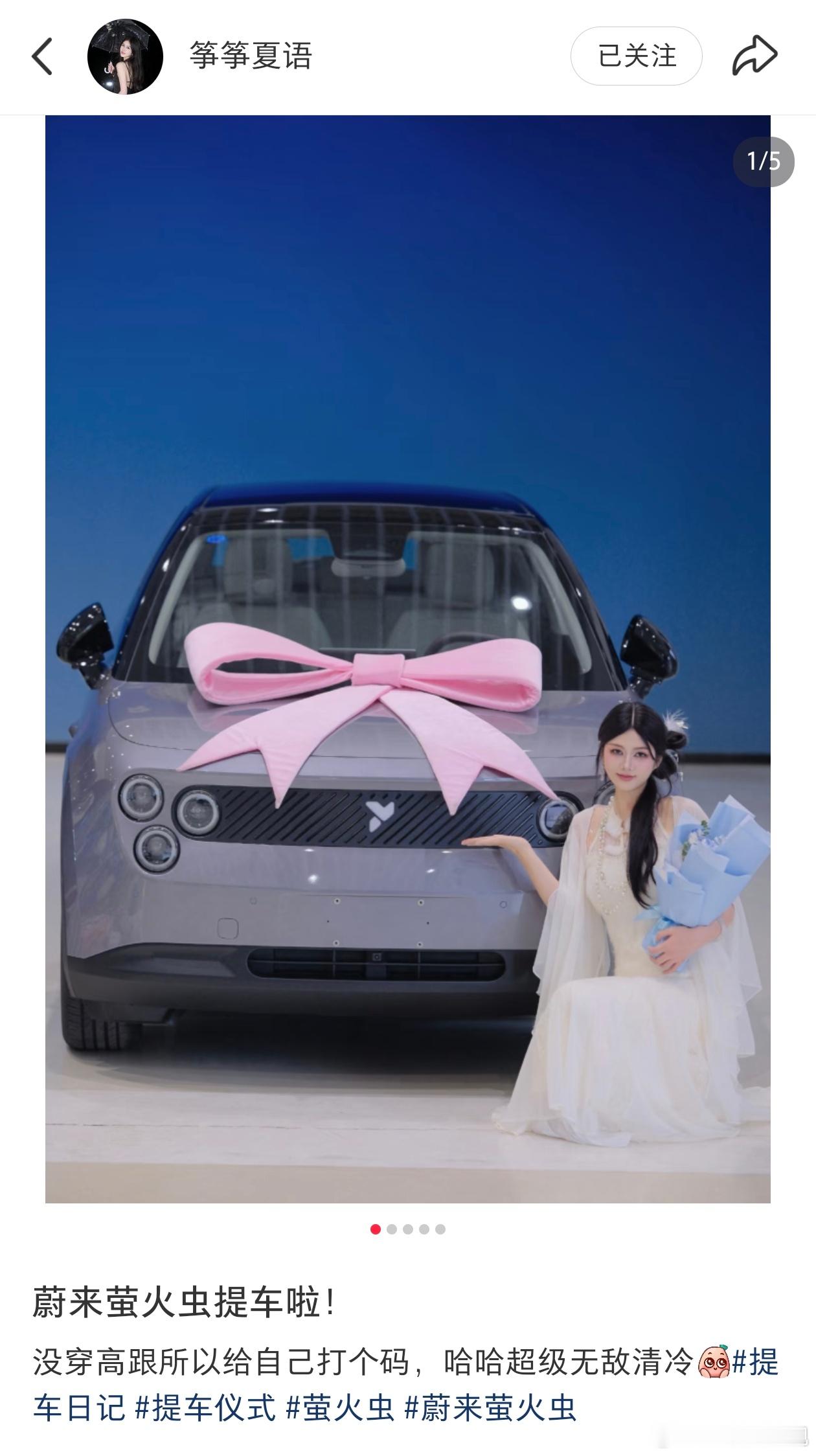 蔚来萤火虫提车啦!没穿高跟所以给自己打个码,哈哈超级无敌清冷[萌萌哒(哎呀,今天只顾着"PQ小课堂"的备课,忘了分享提车日常了。大家可以在xhs关注一波这位“筝筝夏语”小姐姐,人美心善品味好[赞])我为nio代颜蔚来汽车firefly萤火虫