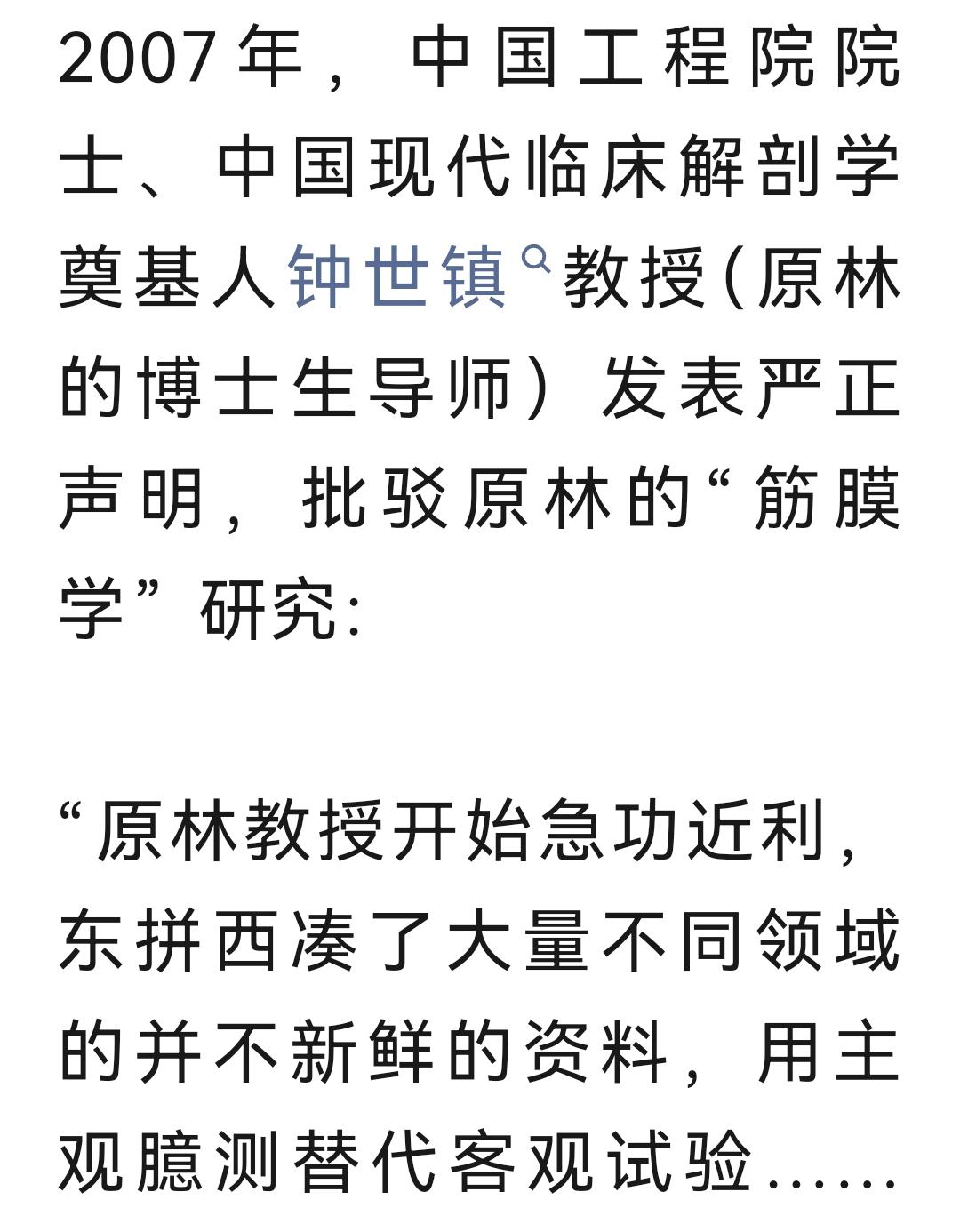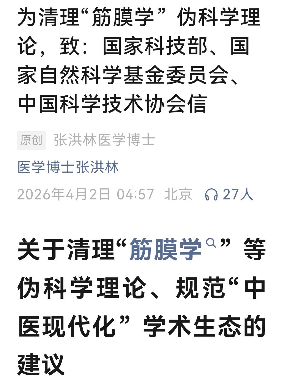 张洪林教授建议清理伪科学“筋膜学”向科技部、科协致信。这个由“原林教授”主创的理论已被学界认定为伪科学,其导师钟世镇院士公开声明,揭露原林的研究是东拼西凑主观臆测,把普通的结缔组织妄称为“第十功能系统”,从而乱卖产品、大搞培训、借机敛财。提醒公众擦亮眼睛,莫交智商税,莫要贻误病情。