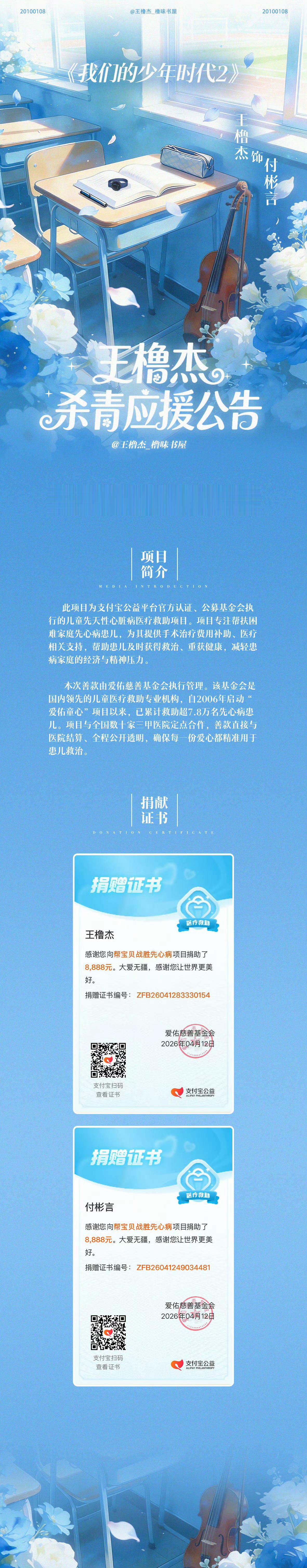 王橹杰粉丝公益应援 王橹杰新剧杀青粉丝发起公益应援!项目专注帮扶困难家庭先心病患儿,提供手术治疗费用,减轻患病家庭的经济与精神压力!希望每个和付彬言一样有着心脏病的孩子们都健康成长,让爱传递王橹杰付彬言公益应援