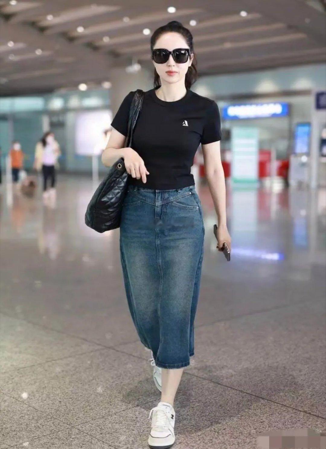董璇黑色T恤低调沉稳衬出好气色,牛仔裙利落清爽自带青春感,二者搭配时髦减龄又高级展现成熟女性的优雅魅力!