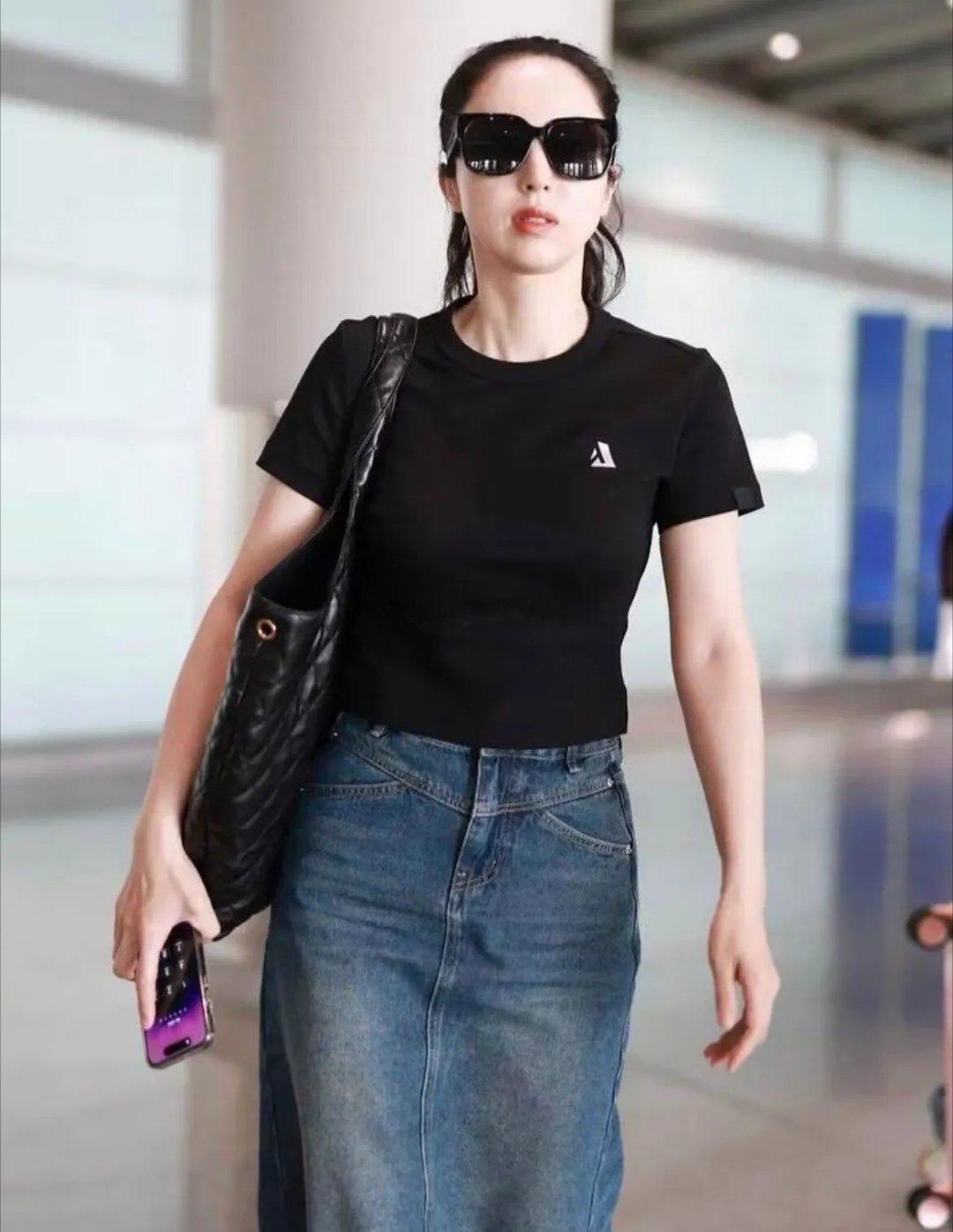 董璇黑色T恤低调沉稳衬出好气色,牛仔裙利落清爽自带青春感,二者搭配时髦减龄又高级