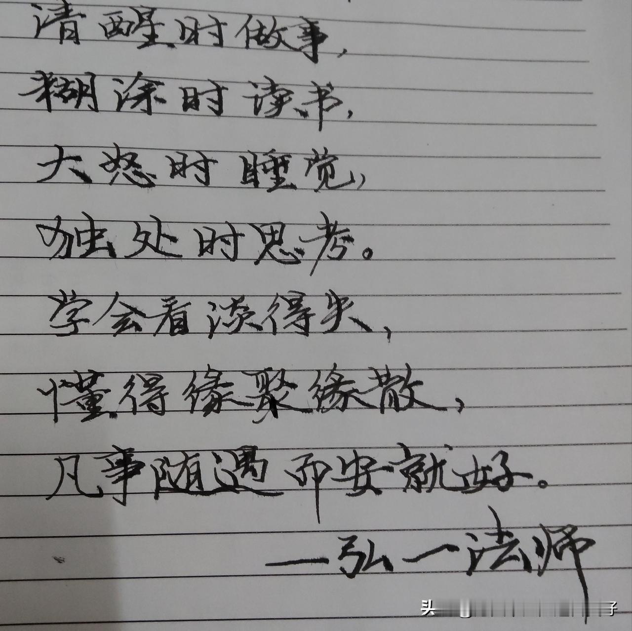 弘一法师 说:“清醒时做事,糊涂时读书,大怒时睡觉,独处时思考,学会看淡得失,懂得缘聚缘散,凡事随遇而安就好。”