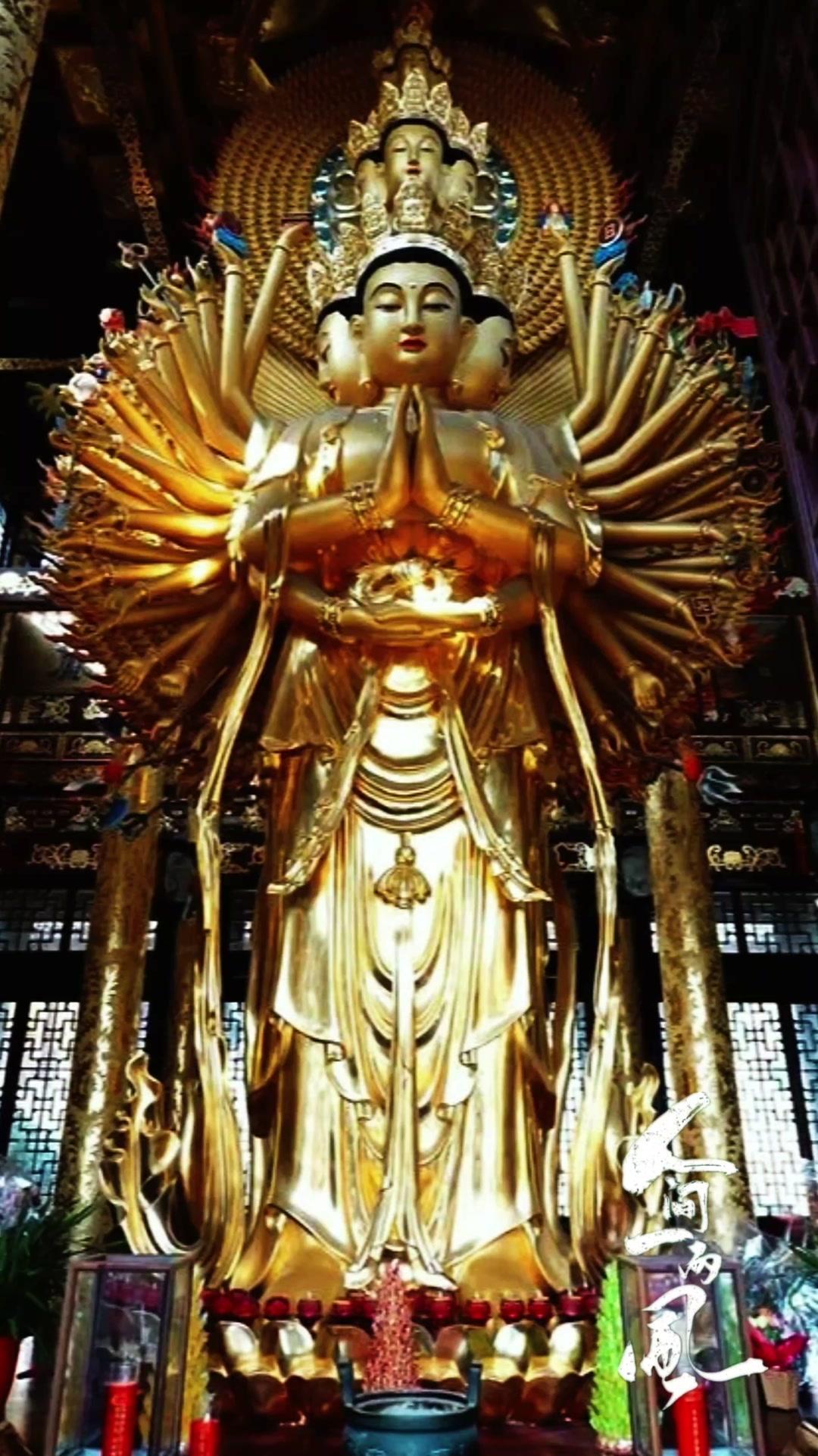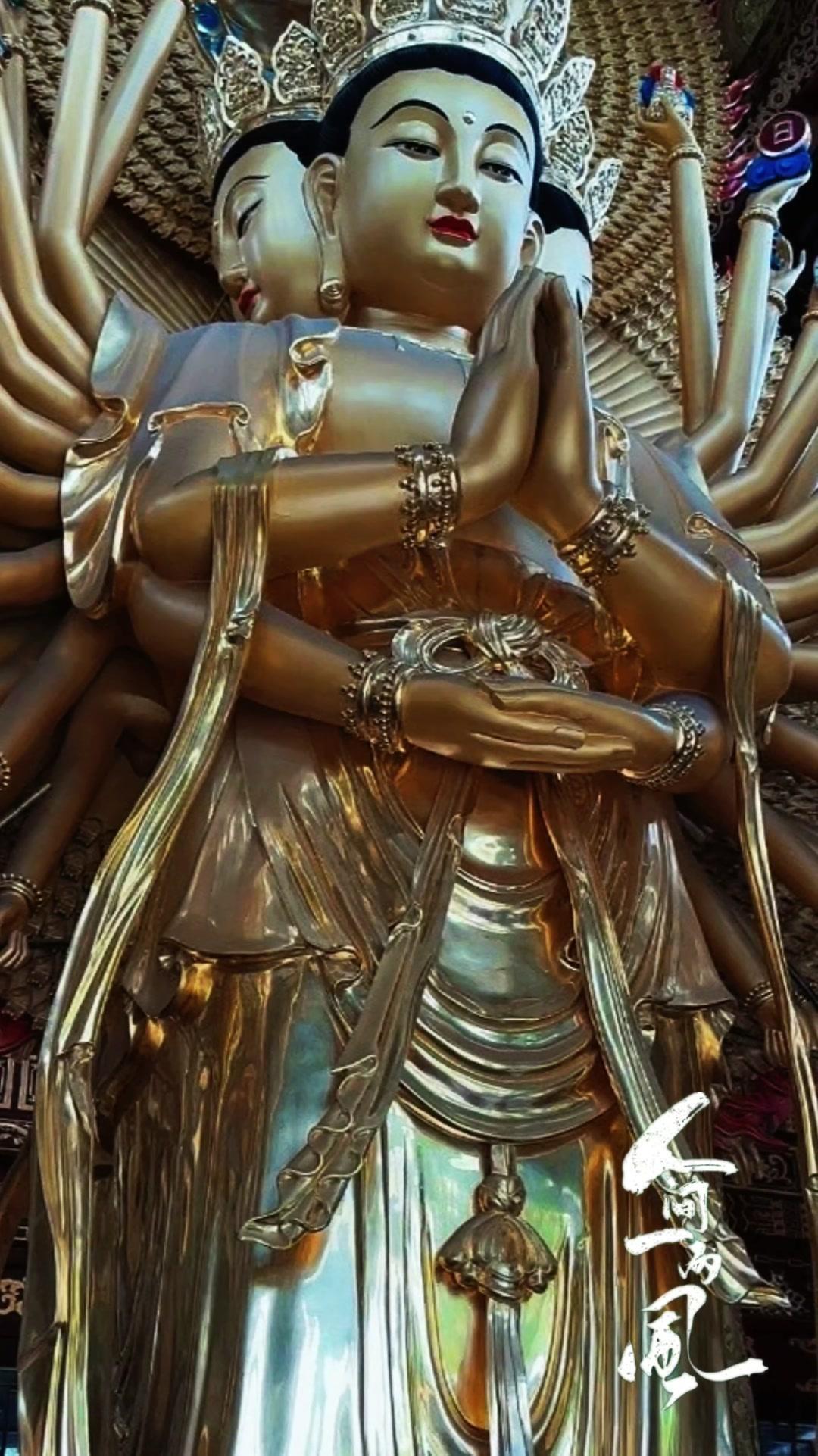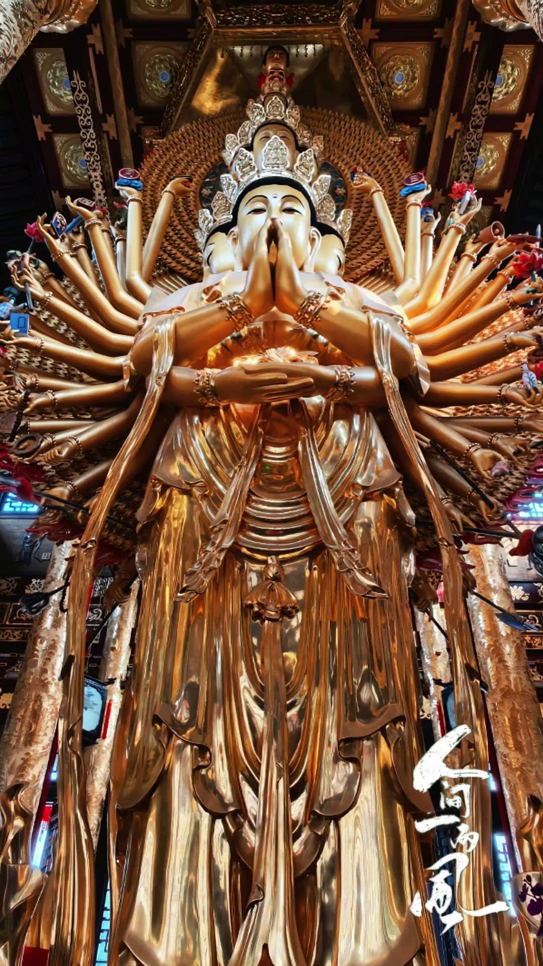 1️⃣大殿中央的9.1米高香樟木千手观音通体鎏金,在殿内光影中泛着温柔光泽,88只大手层层舒展,3000多只小手错落如林,捧着法器、轻捻莲花、静静垂落,仿佛张开一张温柔的网,将所有疲惫迷茫轻轻接住。