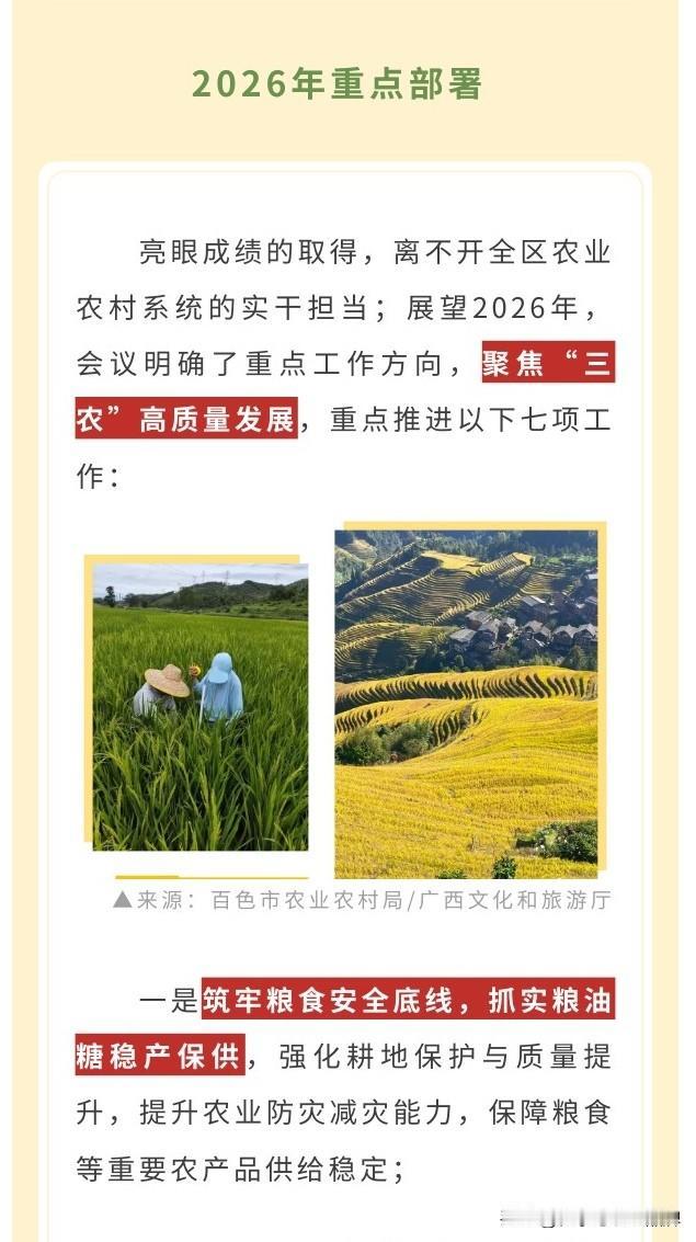 🚀2026年,广西将聚焦七项硬任务:筑牢粮食安全底线、巩固脱贫成果、做强“桂字号”特色农业、强化科技装备支撑、推进绿色乡村建设、深化农村改革、千方百计促农增收,全力推动乡村振兴迈上新台阶!