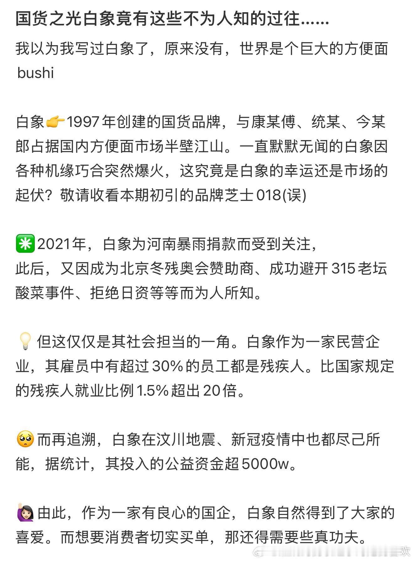 白象是我们中国的民族企业,不仅仅在河南暴雨捐款,赞助残奥会,而且为残疾人提供就业