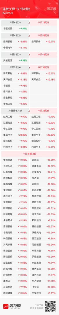 4月15日 今日A股涨停板连板阶梯梳理: 主要集中在医药、大消费、商业航天、半导体、算力等板块。