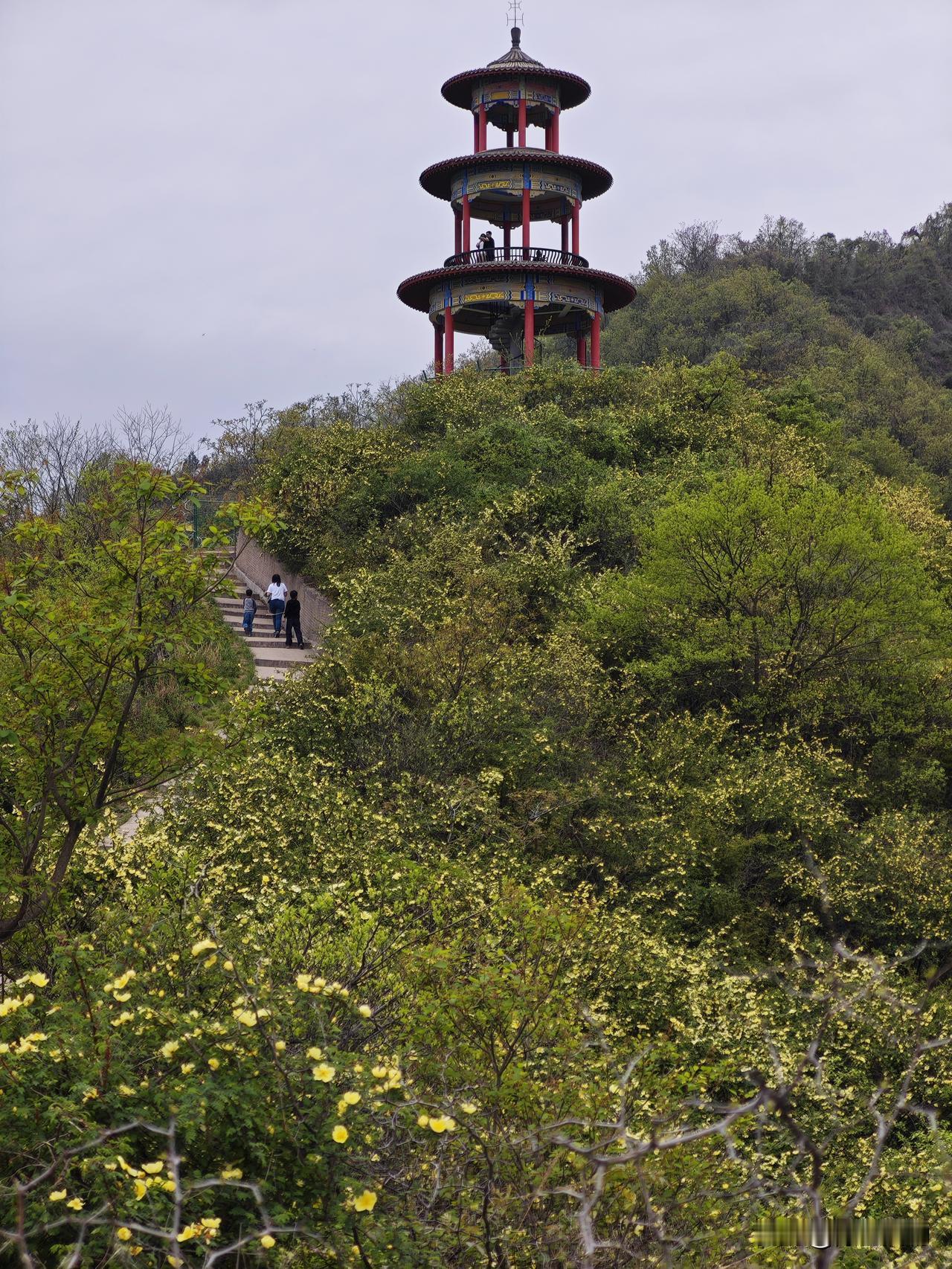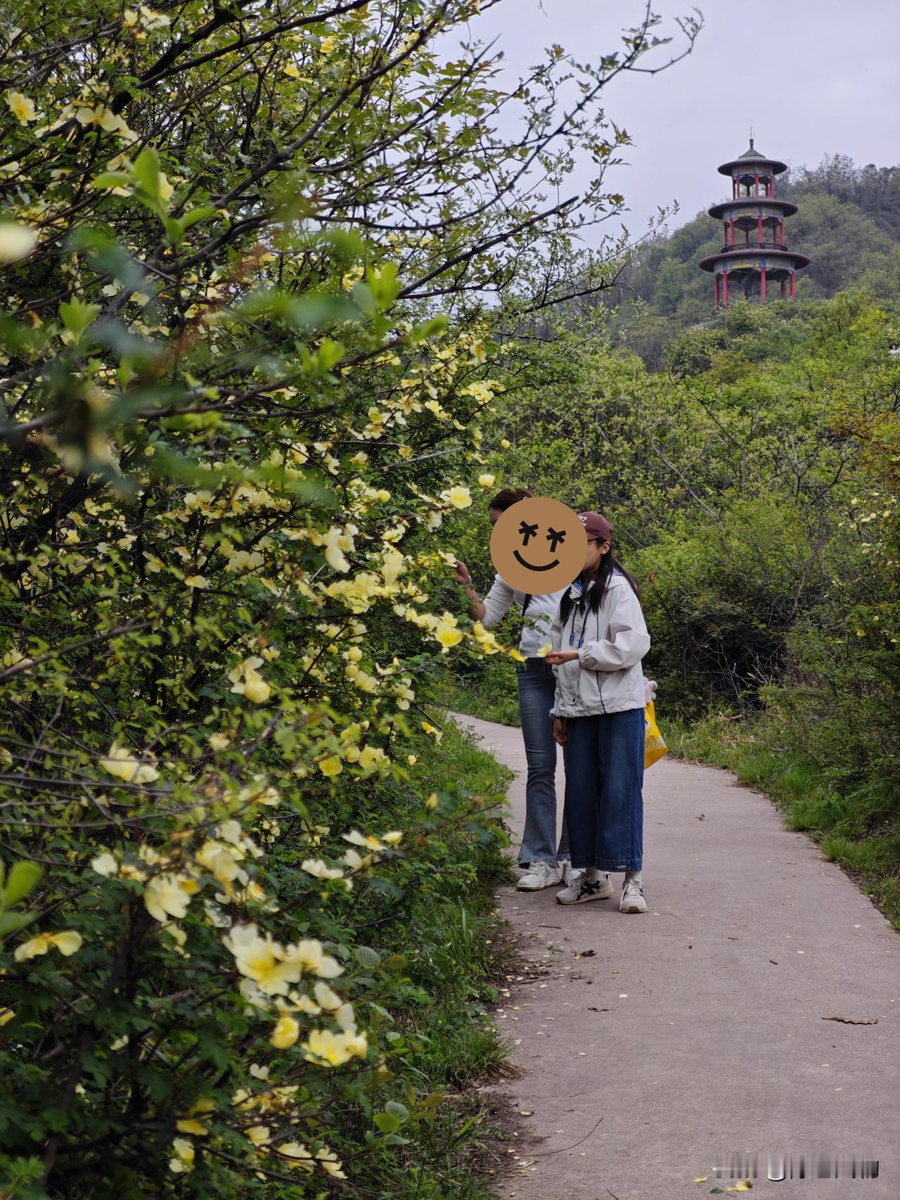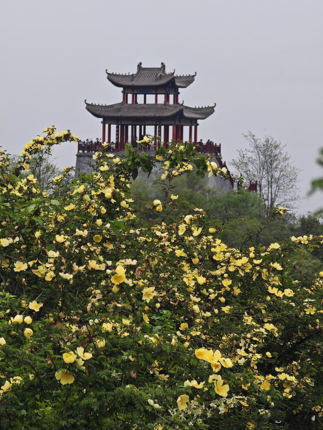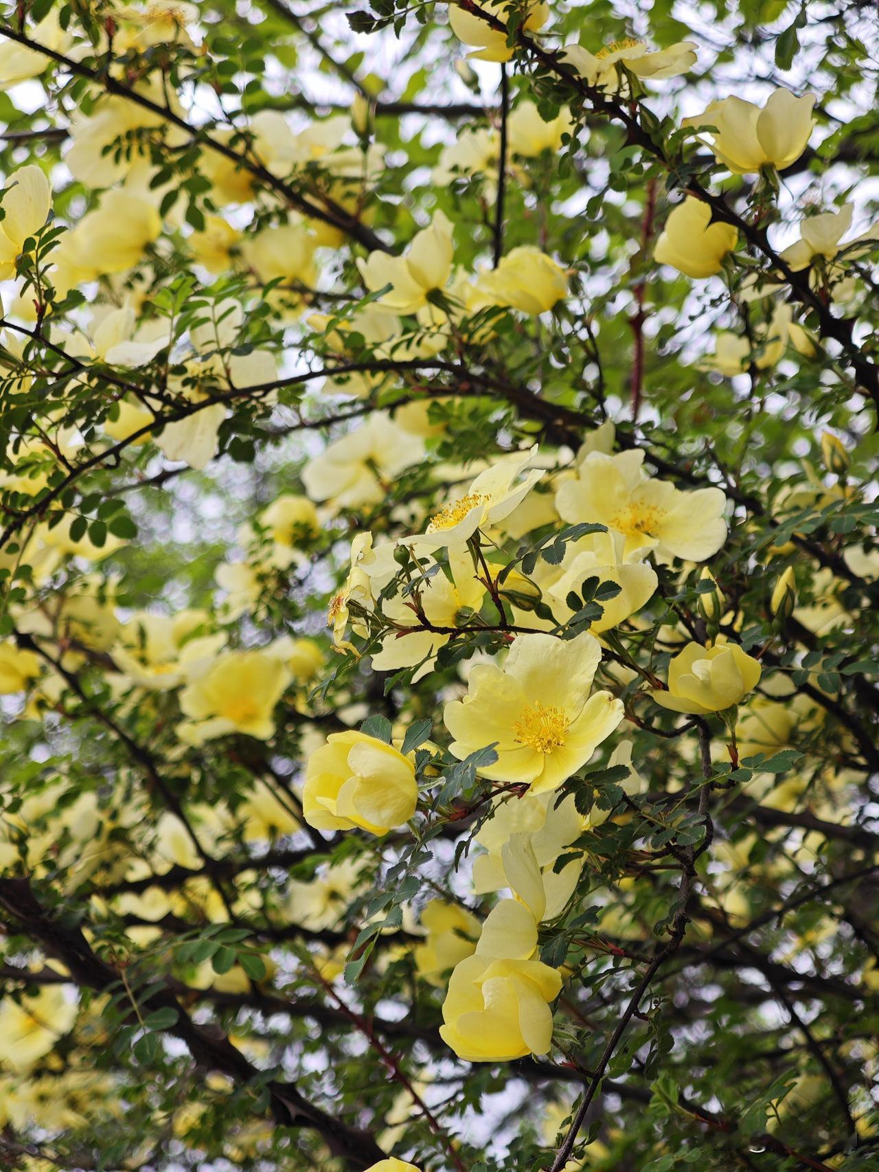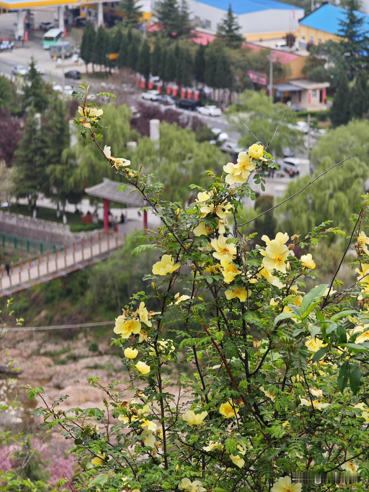 2026年4月11日实拍,宝鸡市渭滨区神农镇太平庄古弓鱼公园漫山黄刺玫盛开。
