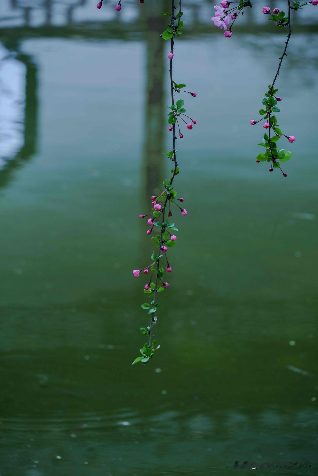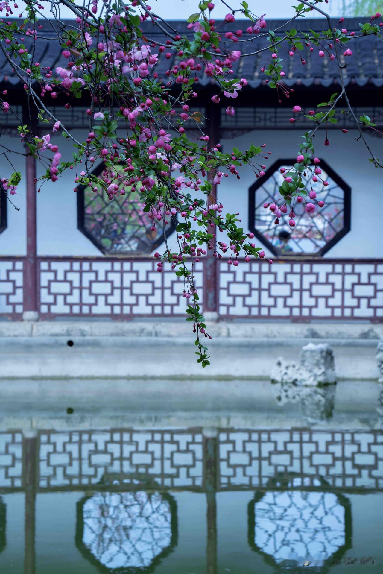 登楼俯瞰,水院全貌尽收眼底。青瓦覆顶,飞檐翘角,错落亭台隐于花影中。澄澈湖水倒映花窗与亭台,海棠枝蔓轻垂,揉成一幅浑然的春日画。