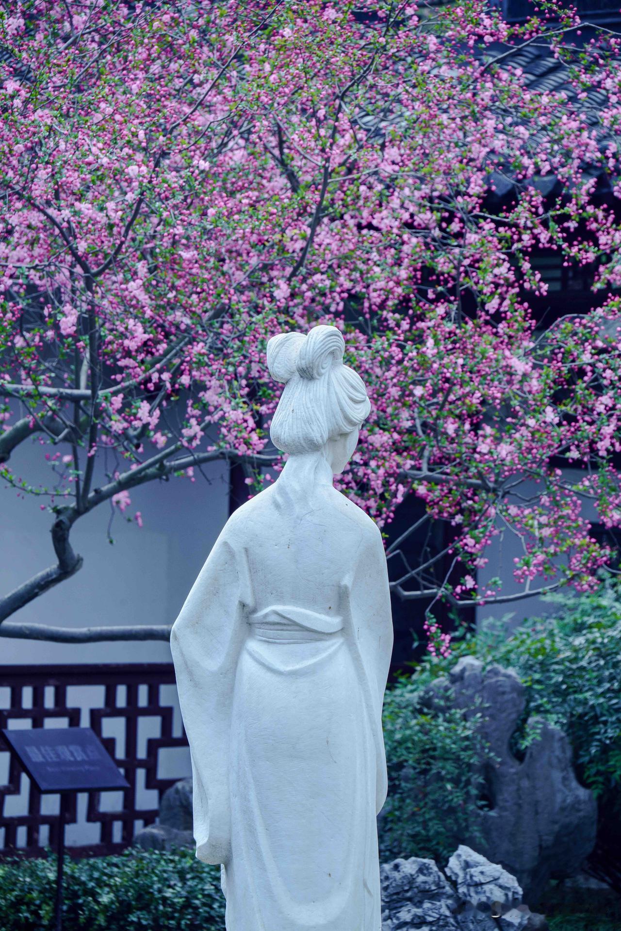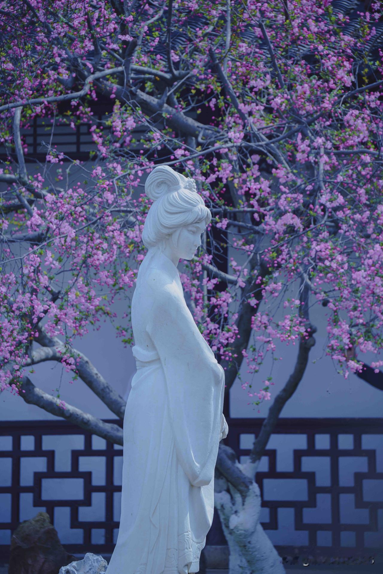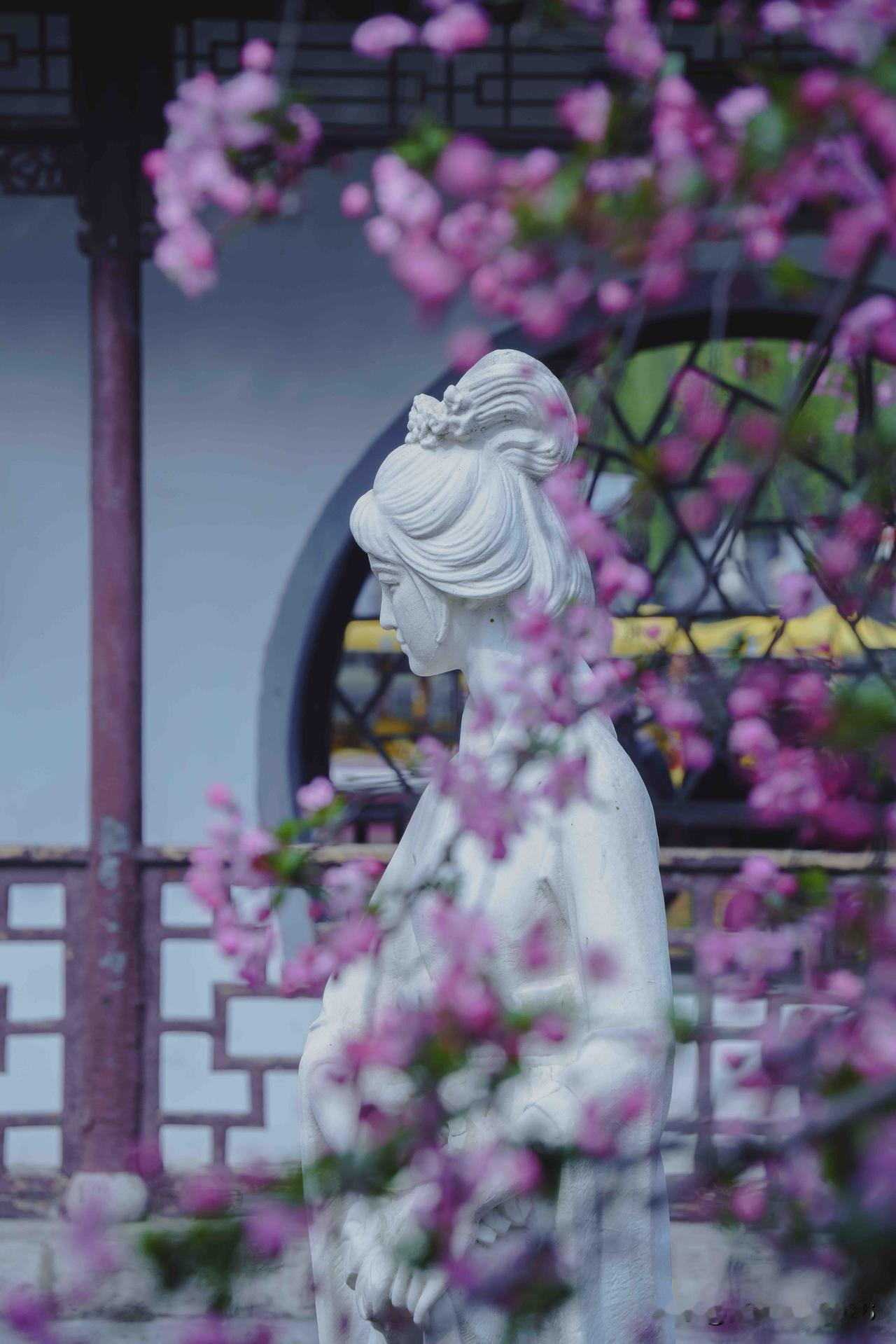 水院,莫愁湖的精髓所在。花窗格纹漏出满树海棠,粉艳花簇垂落,半遮半掩间,是江南造景的巧思。花影映于水面,随波轻晃,为水院添了灵动之气。莫愁女像静立其中,白衣胜雪,纯洁无瑕。她与满院海棠相融,为这方水院注入了无尽灵气。