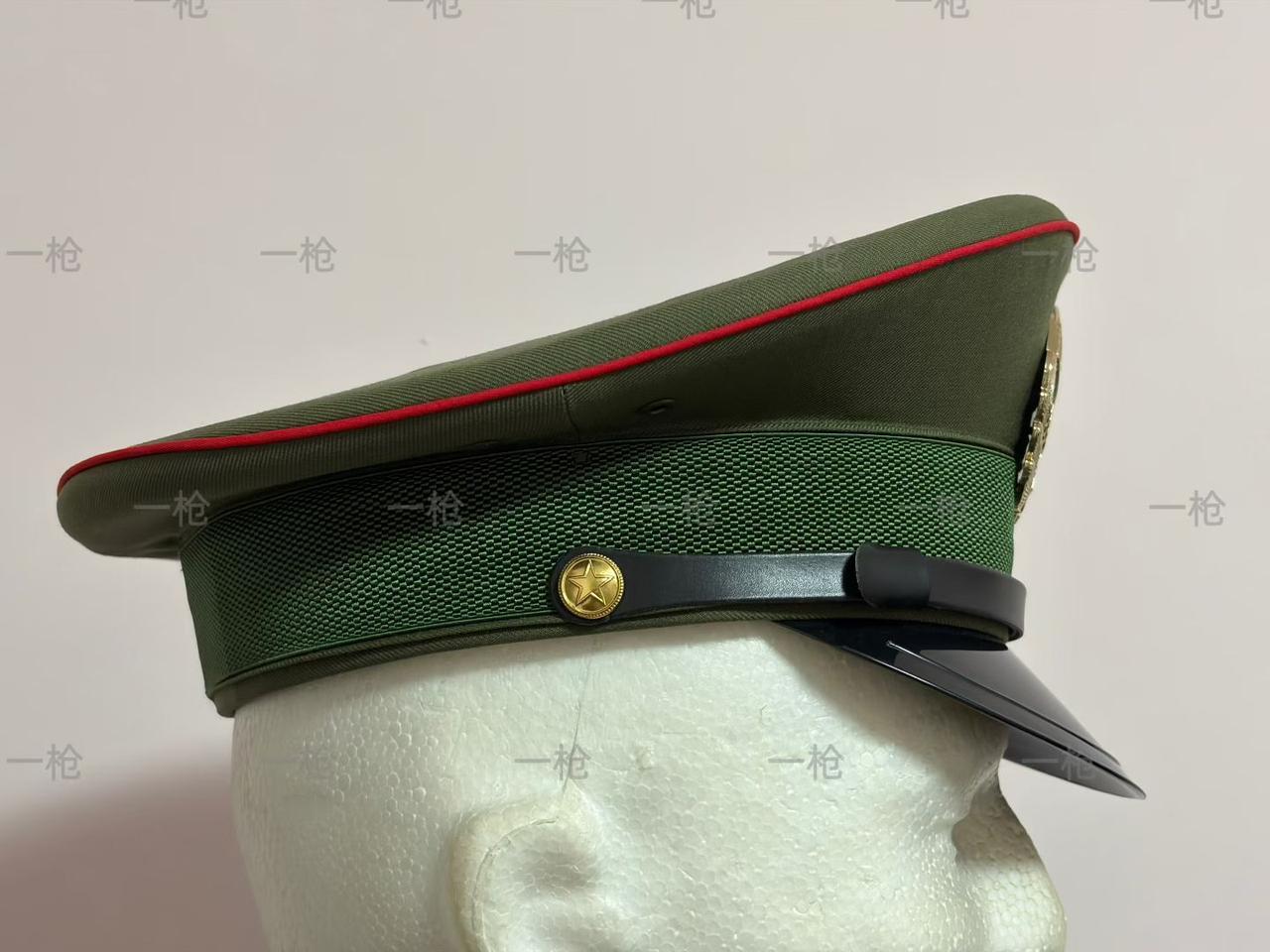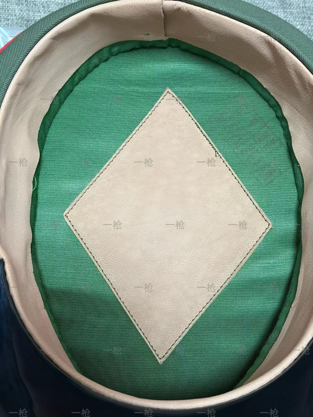 总后军需所中期版本,全真皮汗圈及顶衬。帽型比较翘,仅次于早期试验版。97陆兵帽除了帽徽和布料底色与87不同,最大的差异是帽墙饰带取消了军种色窄条,乍一看更接近85陆兵帽。但85是无帽墙饰带直接露出布料底色的绿,而97是则是纯绿色饰带。
