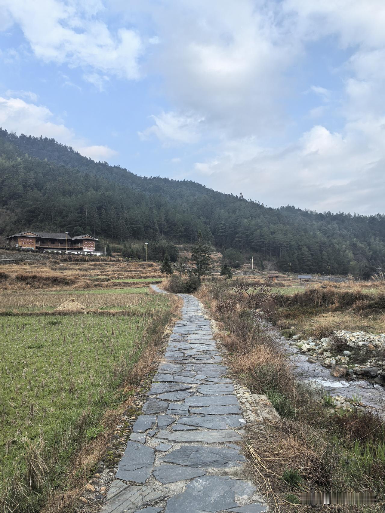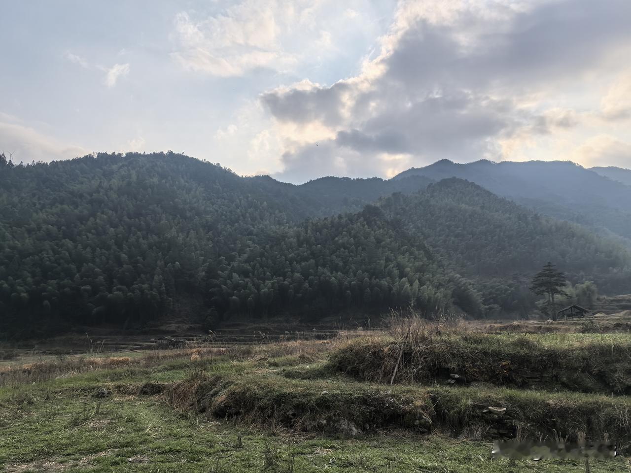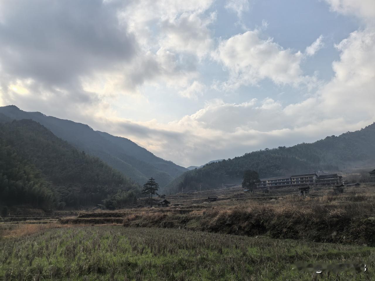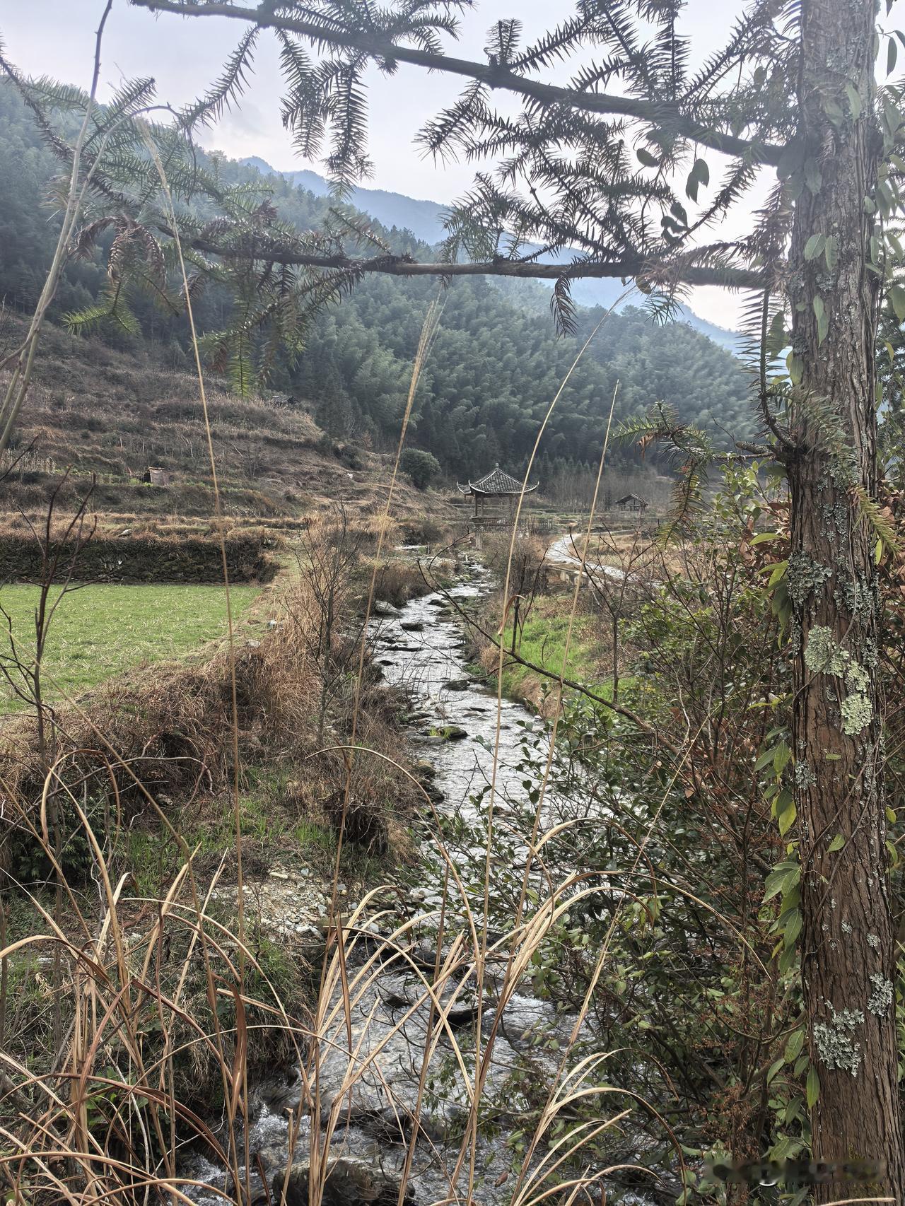 四面环山,小溪沿山脚下缓缓流淌。