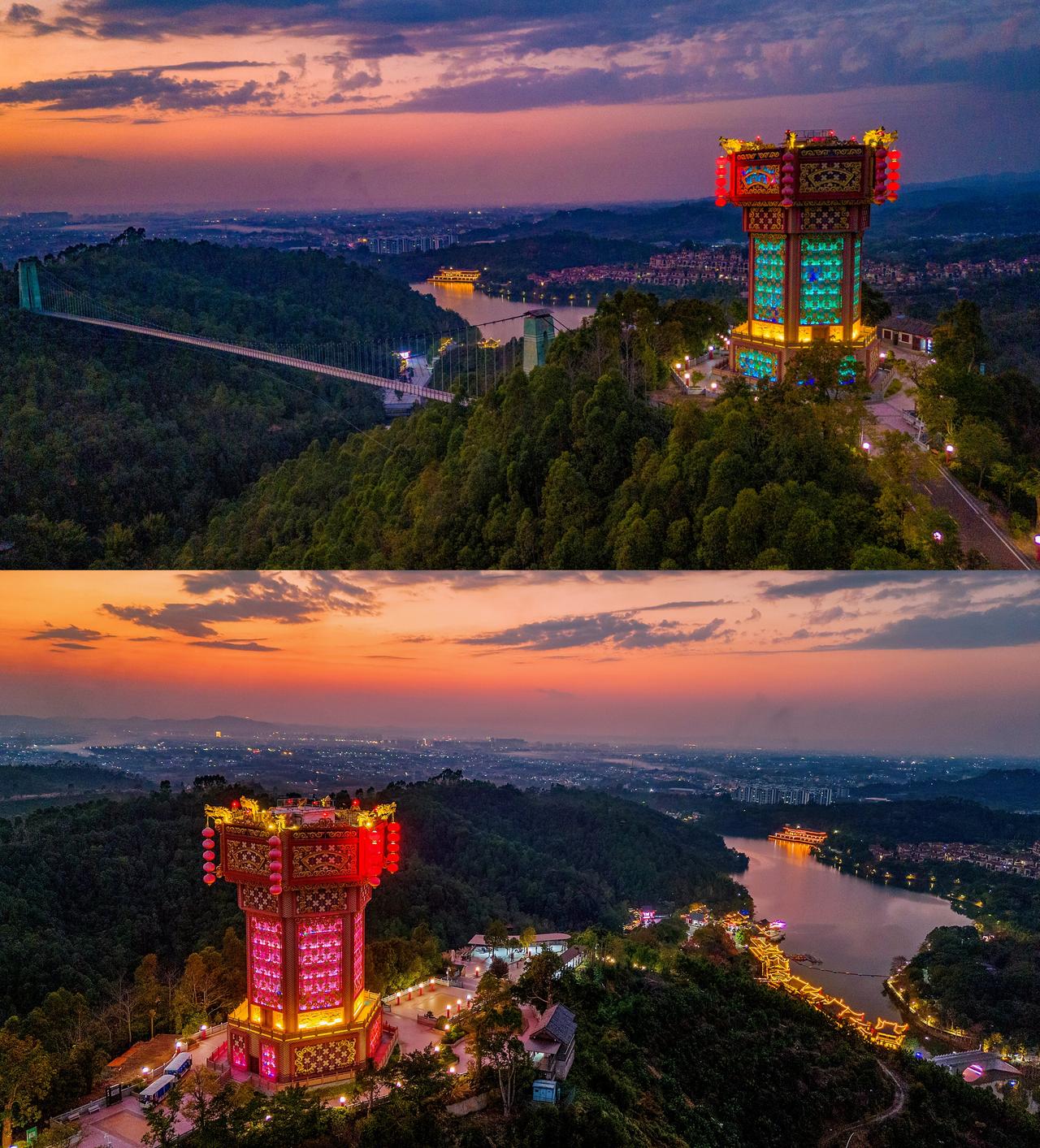 傍晚,花灯博物馆亮灯,和晚霞山色争辉,特别惊艳