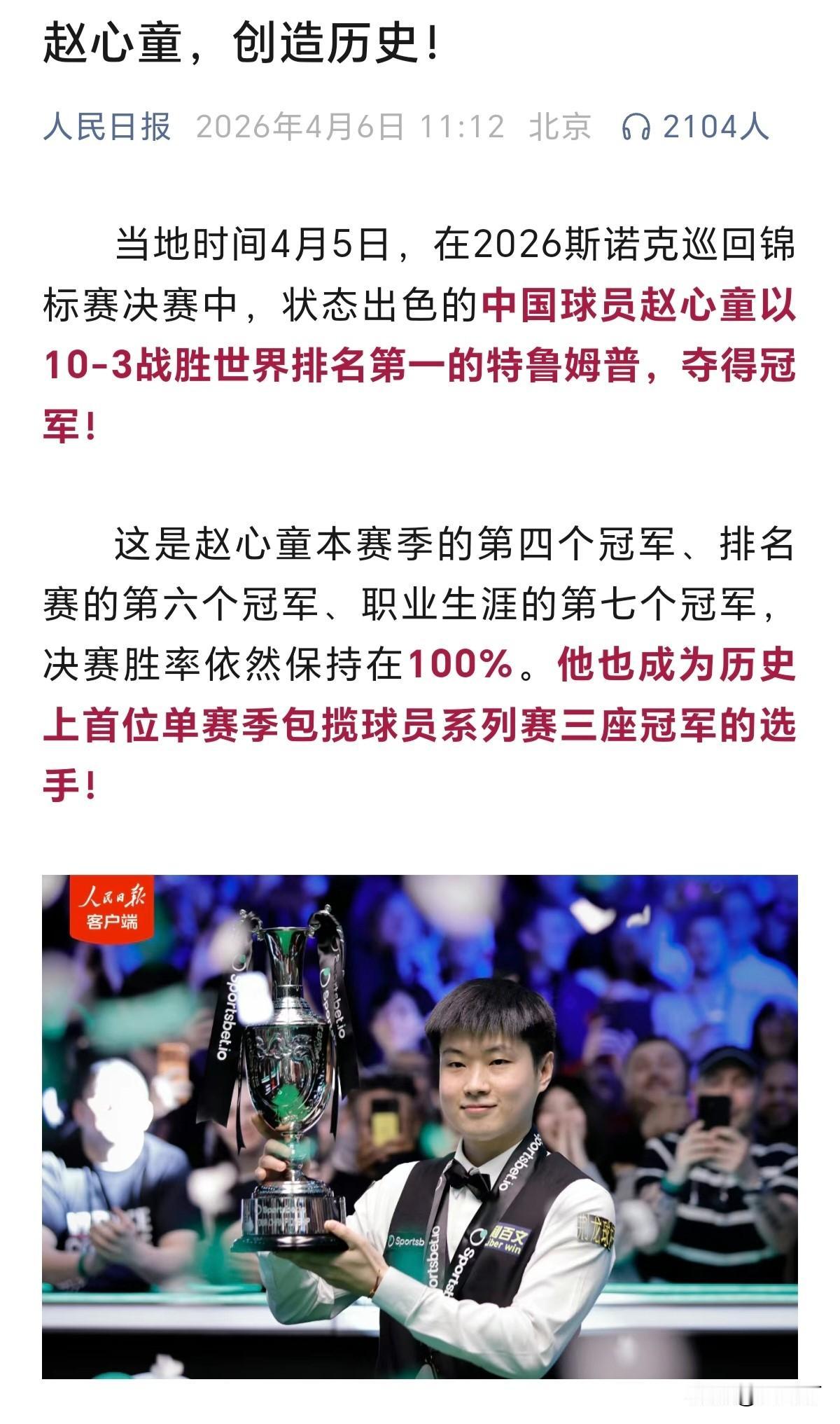 北京时间4月6日凌晨,斯诺克赛场传来重磅喜讯。在2026年斯诺克巡回锦标赛决赛中,中国天才球手赵心童以10比3的悬殊比分,完胜世界排名第一的特鲁姆普,强势捧起冠军奖杯。这场胜利不仅让他本赛季的冠军数达到4个,更使他成为斯诺克历史上首位单赛季包揽球员系列赛三冠的选手。《人民日报》也发文盛赞,称他“用实力书写了中国斯诺克的传奇”。
