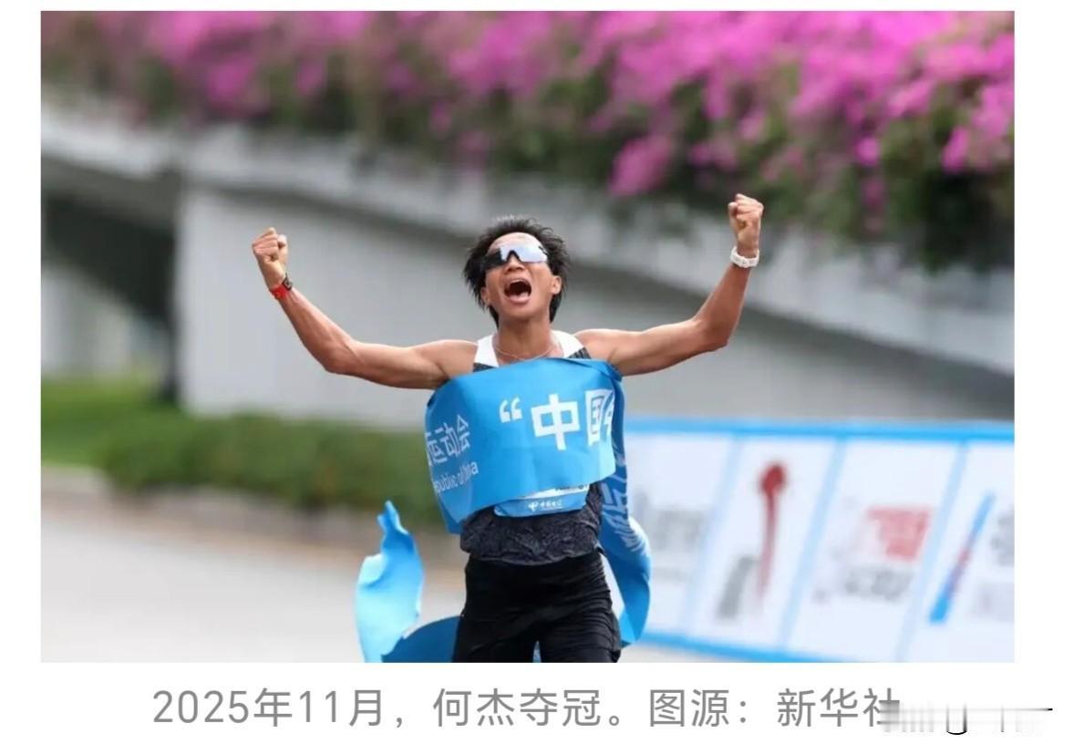 何杰,1998年出生,宁夏体育运动训练管理中心的运动员兼马拉松队副教练。2025年全运会男子马拉松,他以2小时12分07秒夺冠。冲线后他喊了一句:“谁说宁夏长不出玫瑰?!我就是啊!”那场比赛为宁夏拿下了时隔38年的全运会夏季项目首金。他也由此集齐了亚运冠军、全运冠军和全国纪录,算得上大满贯了。