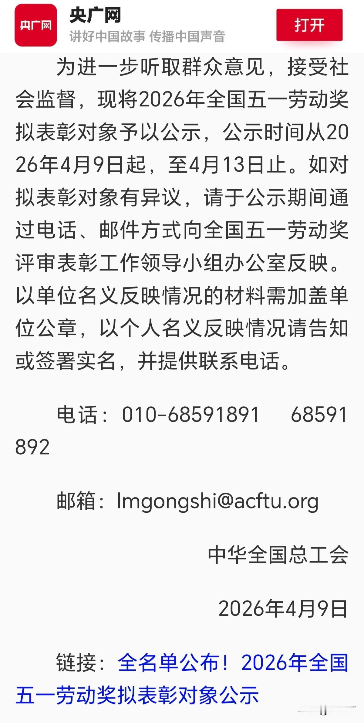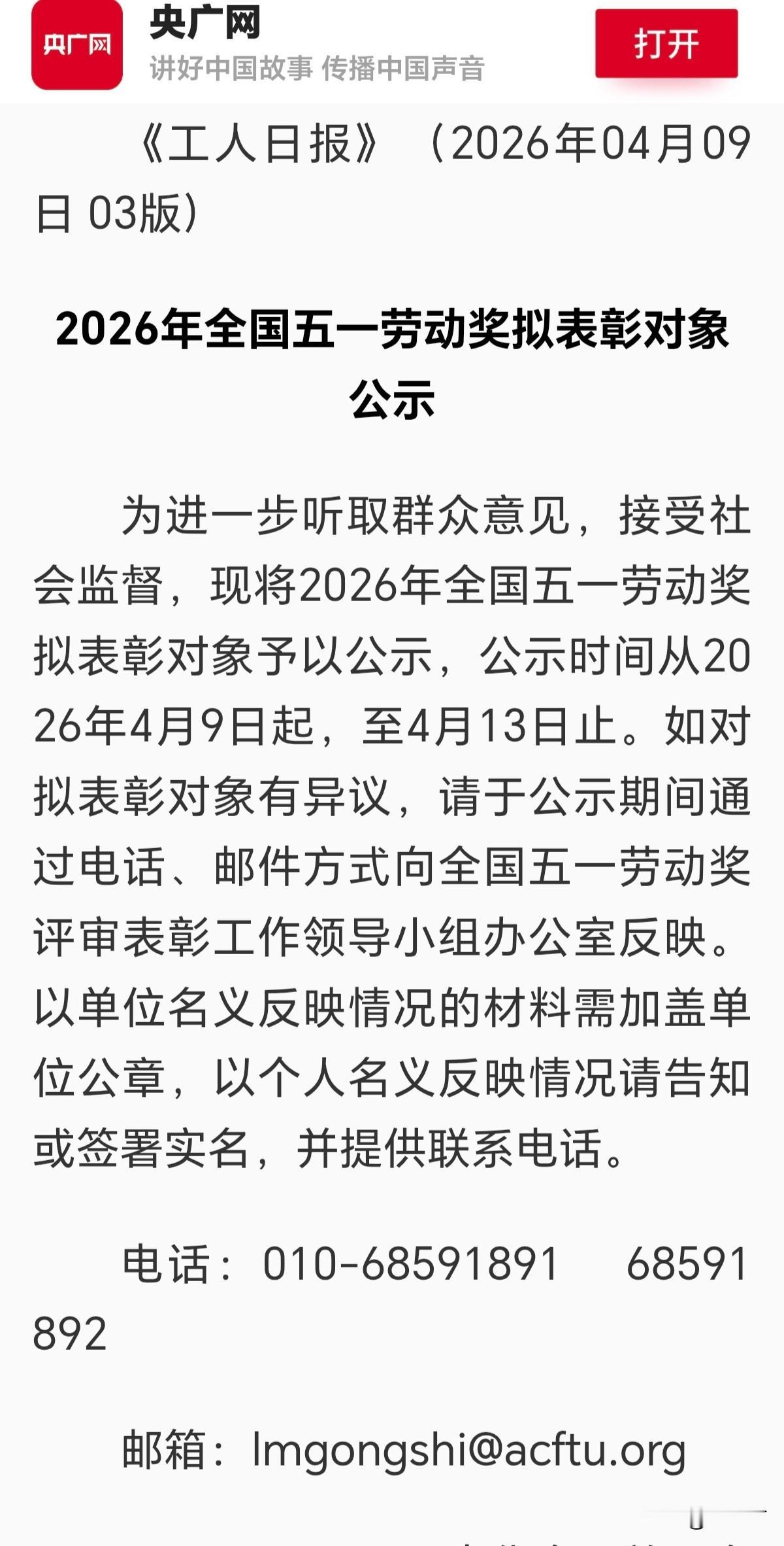 4月9日,中华全国总工会公示了2026年全国五一劳动奖拟表彰名单。央视主持人撒贝宁、马拉松运动员何杰、网球运动员张帅,都在拟获全国五一劳动奖章的人员之列。公示期到4月13日。