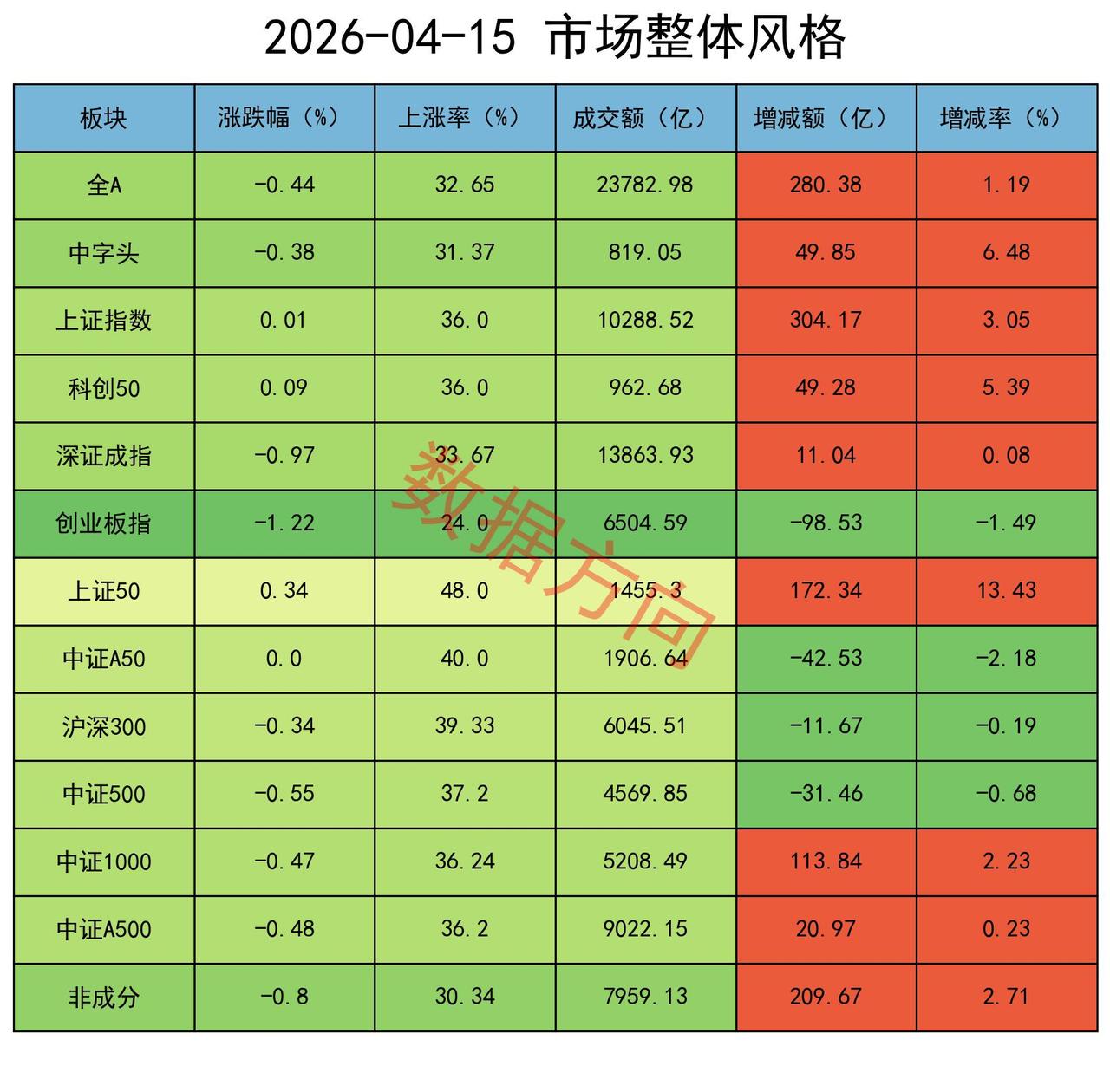 仅有上证50、科创指数等飘红,涨幅分别为0.34%、0.09%。