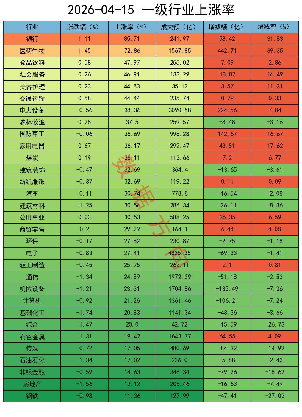 银行,涨幅1.11%,个股上涨率86%,大幅放量32%